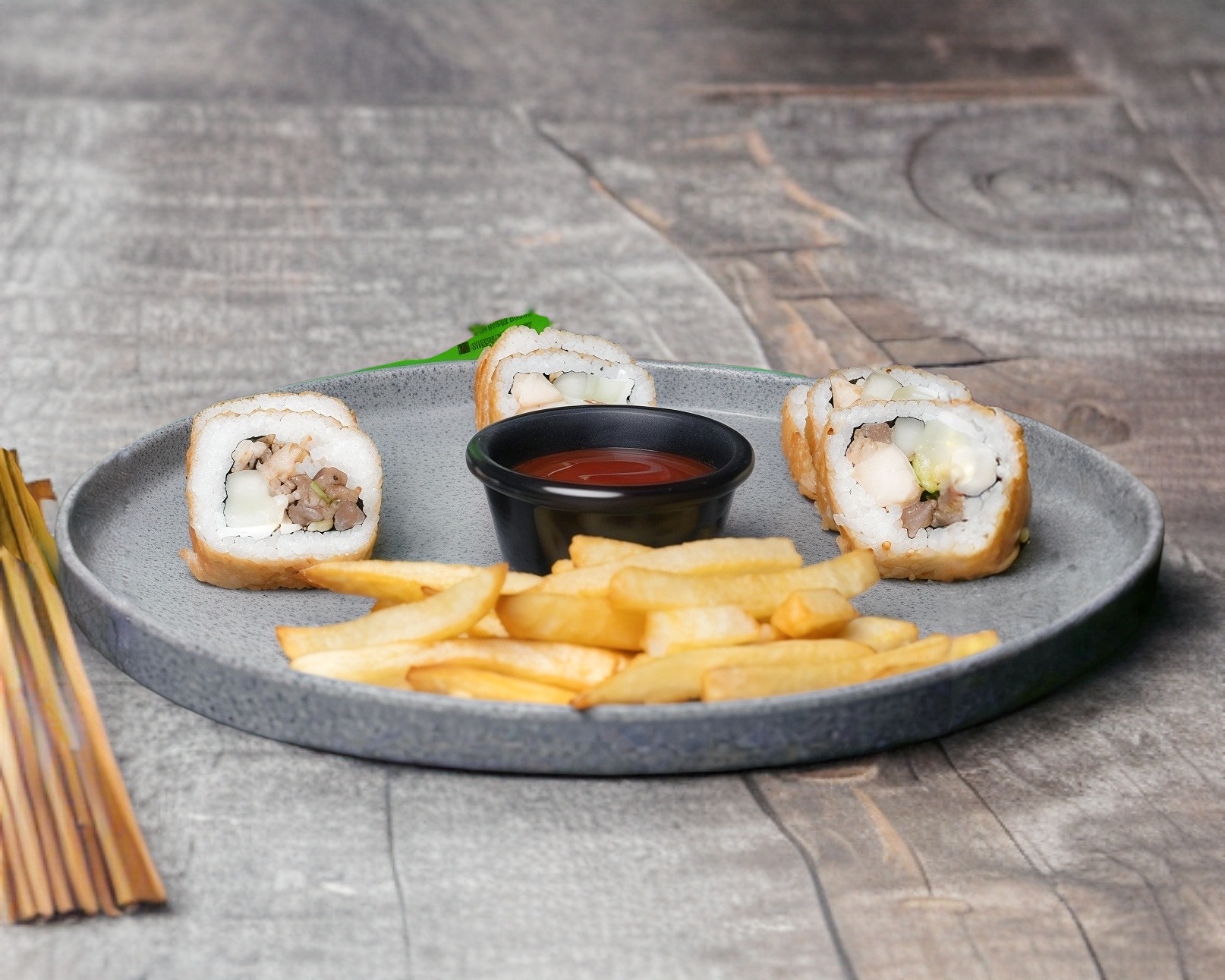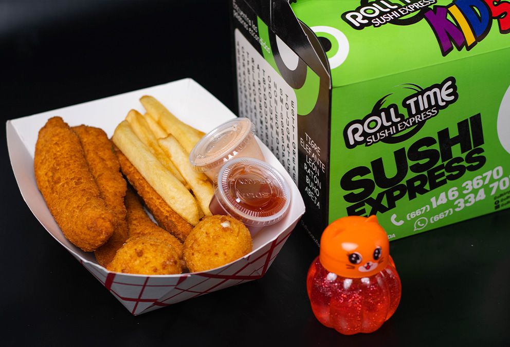 Rollo de 10 piezas, hecho de res, pepino, aguacate, philadelphia, pollo, con papas a la francesa, con bebida y juguete sorpresa.