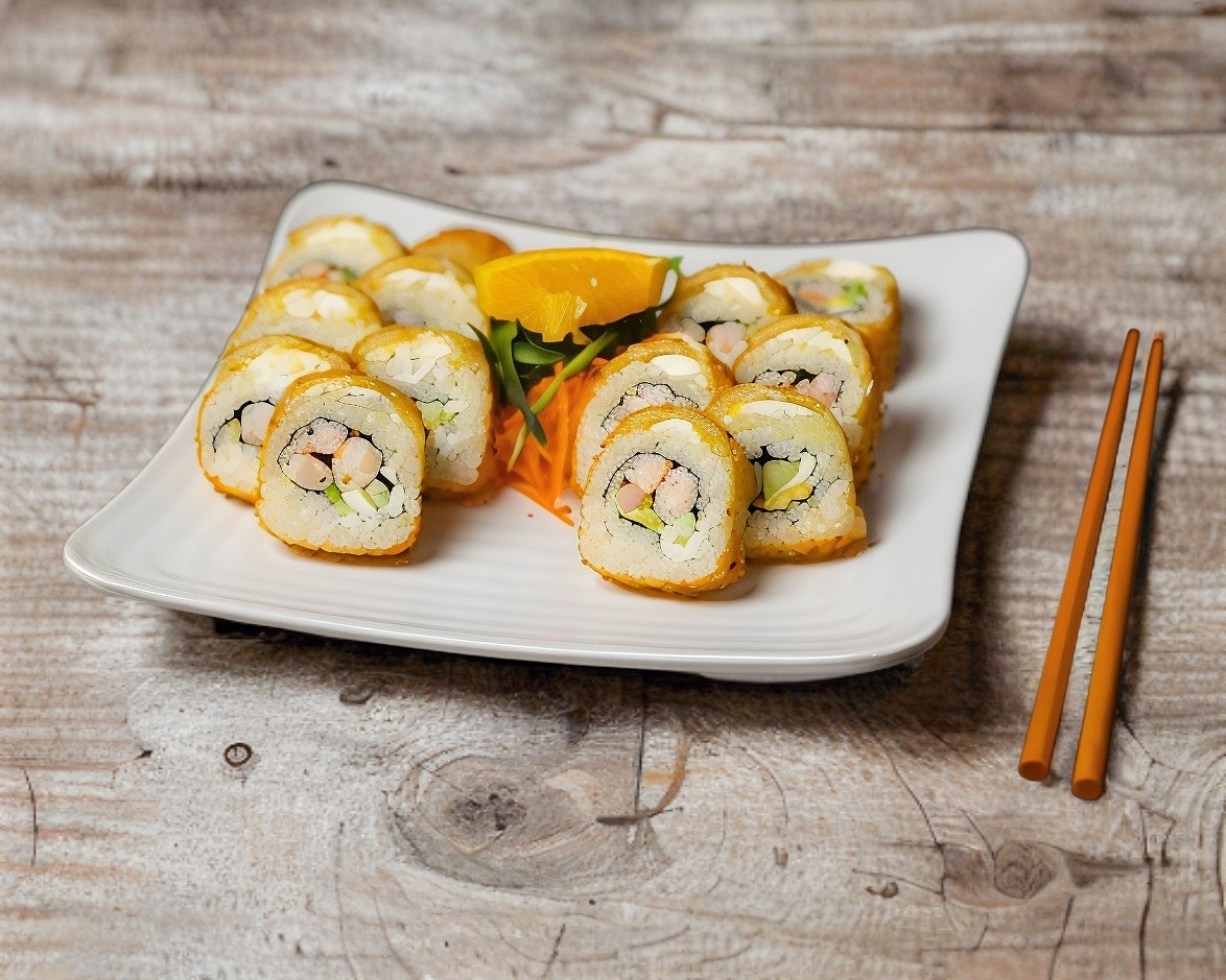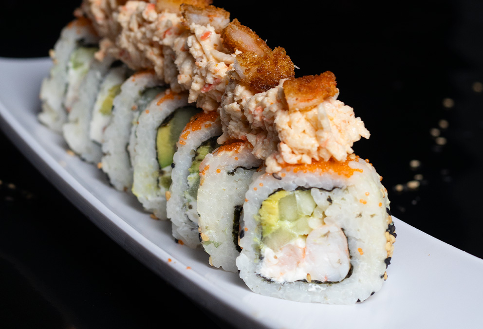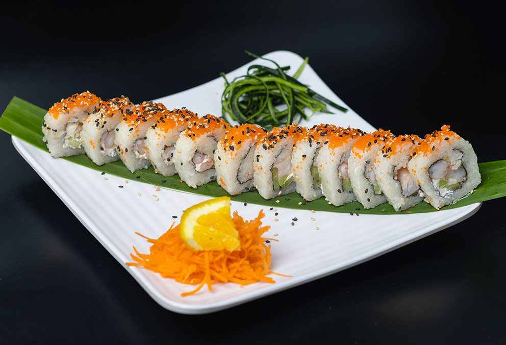Rollo con phila, pepino, camarón, aguacate, surimi spicy, masago y camarón empanizado por fuera.