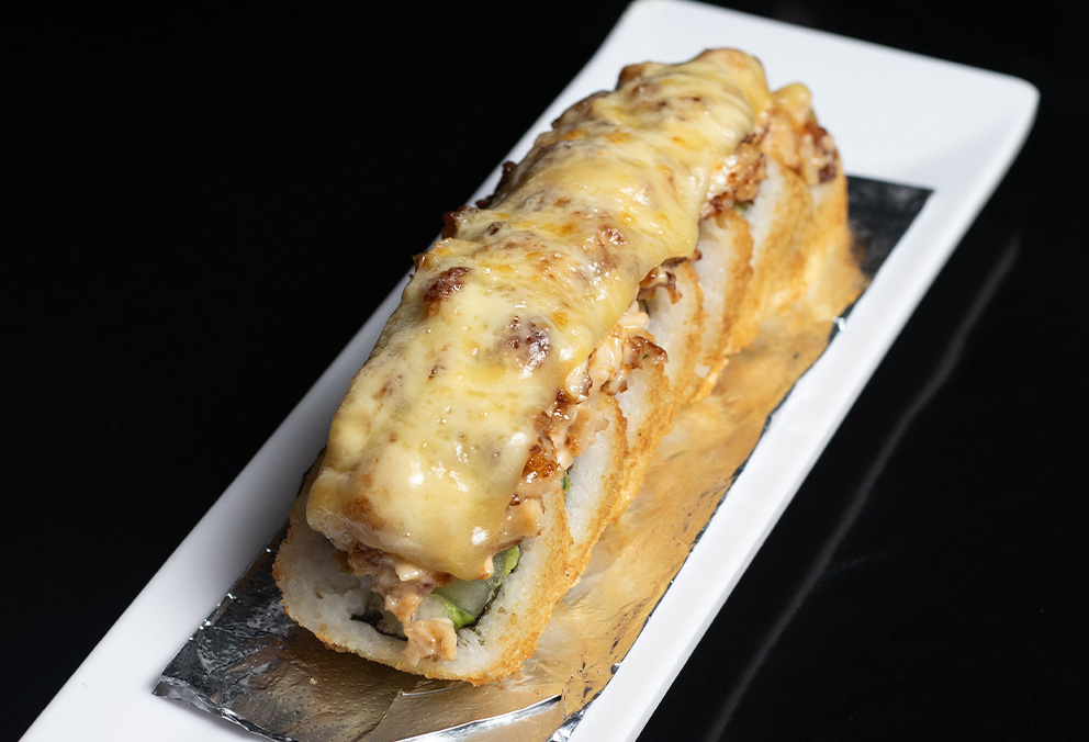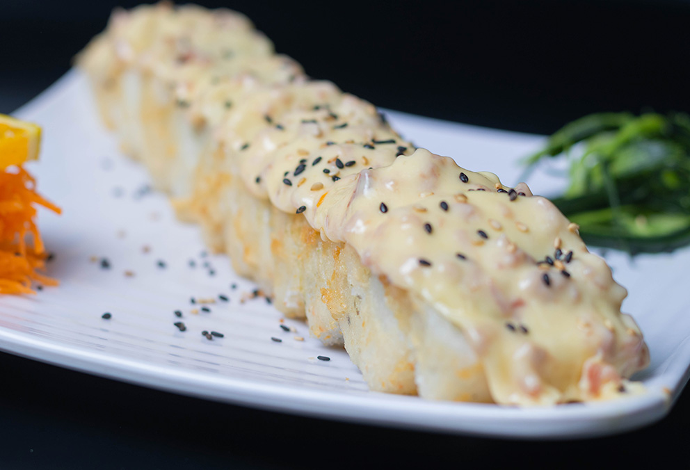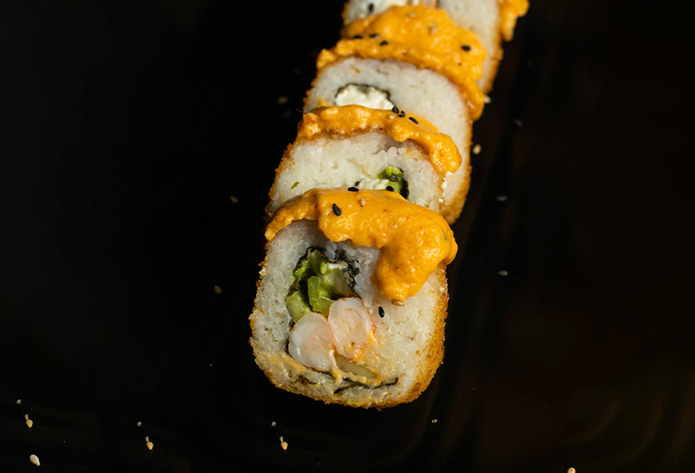 Rollo con philadelphia, aguacate, pepino, camarón, coronado con queso y aderezo spicy.
