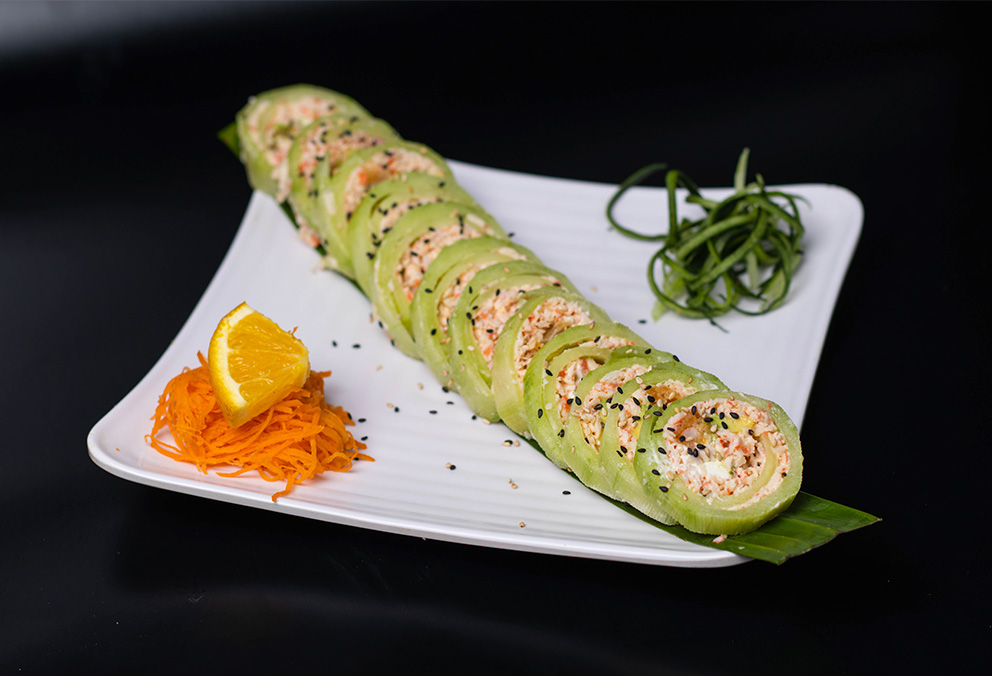 Rollo sin arroz con camarón, tempura, Tampico spicy, aguacate, phila, envuelto en sabana de pepino.