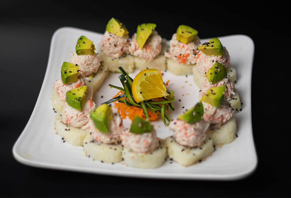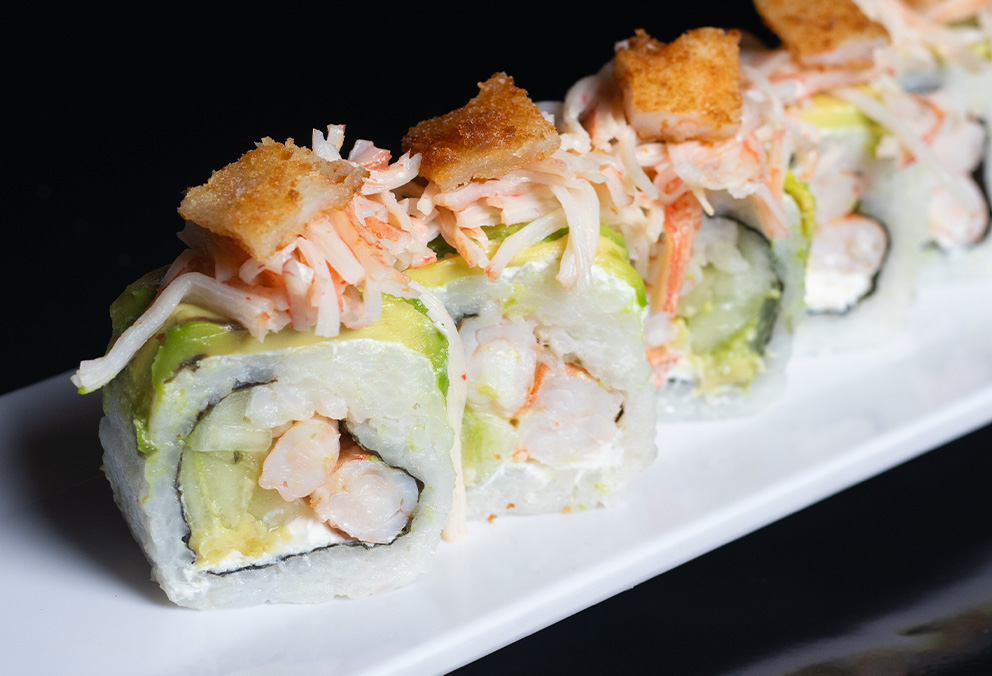 Rollo con phila, pepino, camarón capeado, aguacate, forrado de aguacate y coronado con ensalada kani, camarón empanizado por fuera.