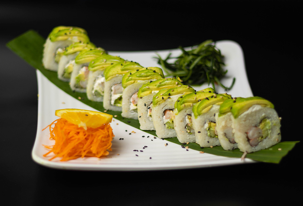 Rollo natural con base de aguacate, phila, camarón y aguacate por fuera.