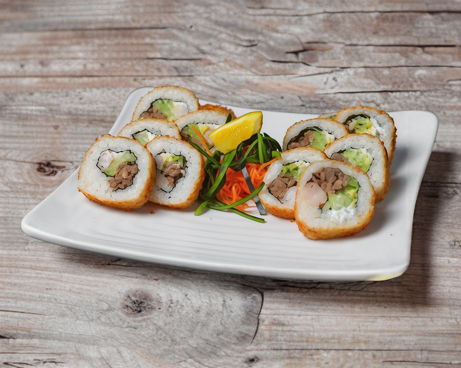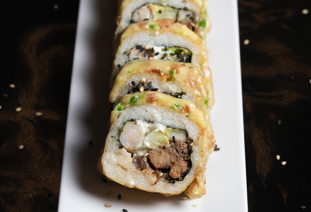 Rollo Empanizado con base de aguacate, phila, pepino, relleno de res y camarón.
