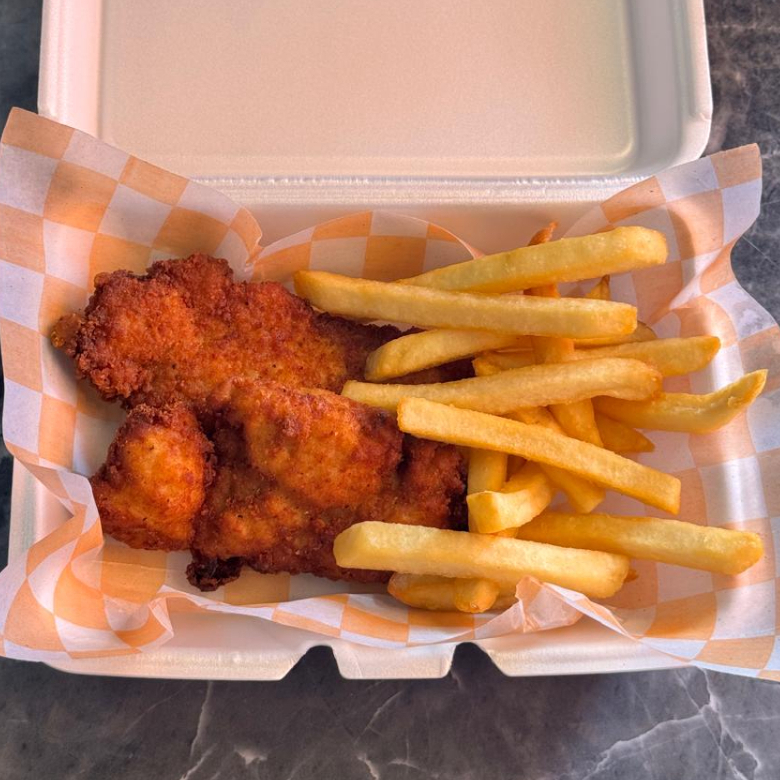 Deliciosos Tenders de pechuga de pollo acompañados de papas fritas y dos aderezos a elegir
