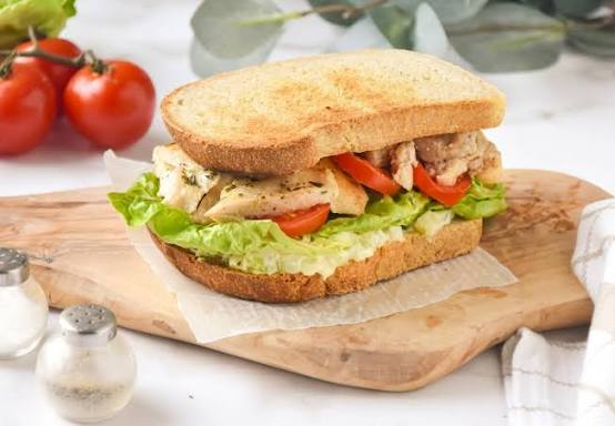 sandwich de pollo a la plancha, queso americano lechuga, tomate, cebolla