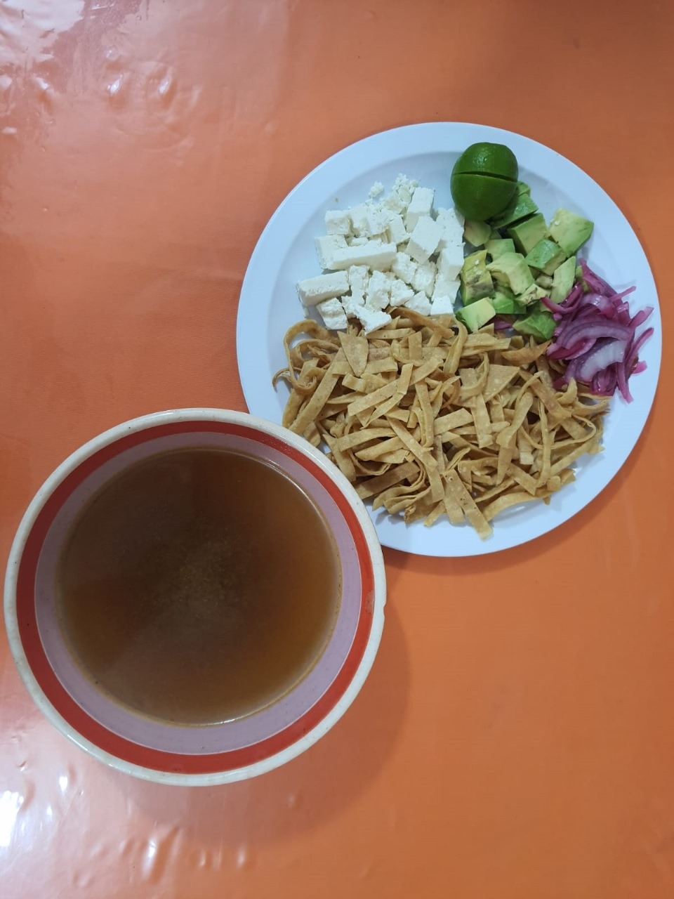 Fritura de maíz en tiras, con caldo de res, cebolla curtida, aguacate, queso oreado, limón y crema. Todo se entrega separado para que lo armes.