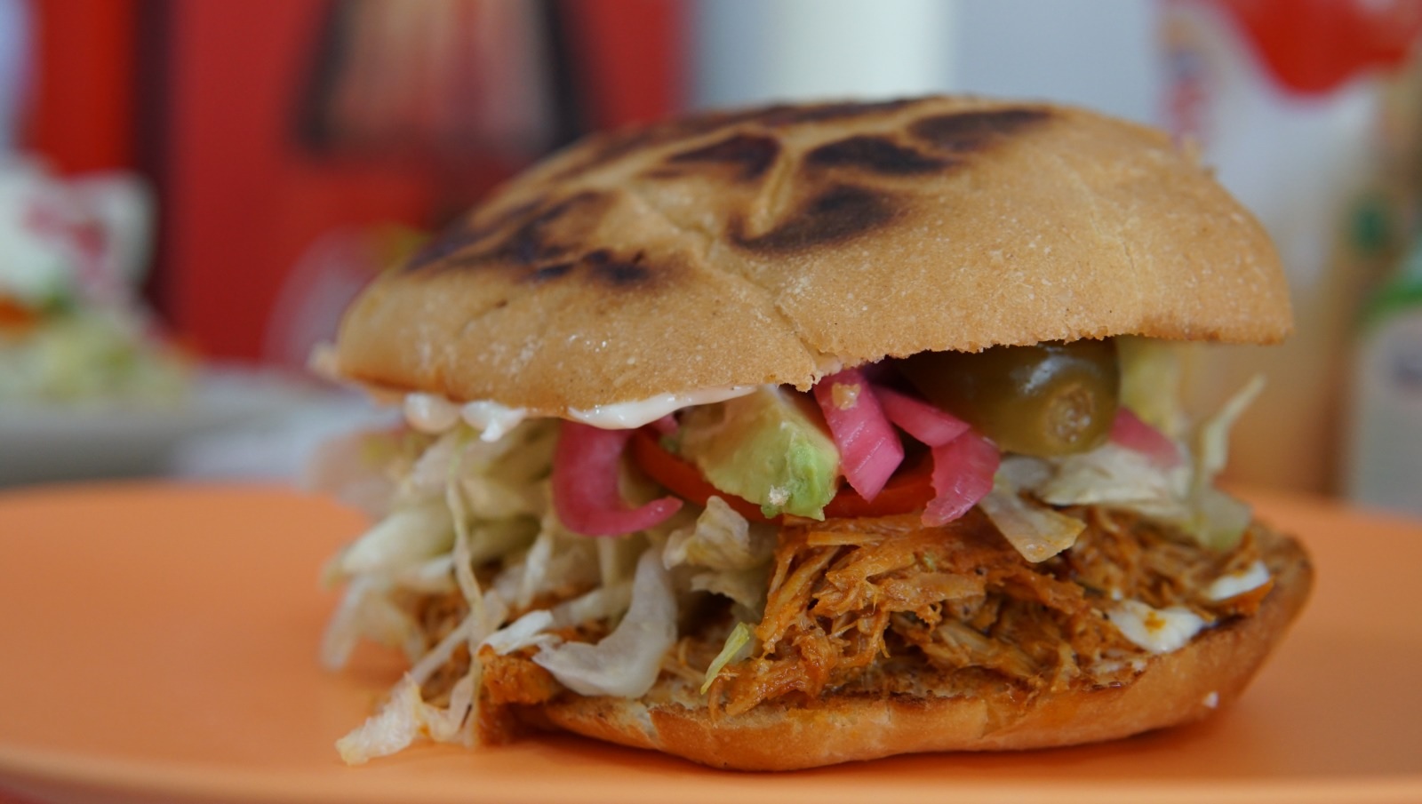 Pan telera con cochinita, jamón, queso, lechuga, tomate, cebolla curtida, aguacate.