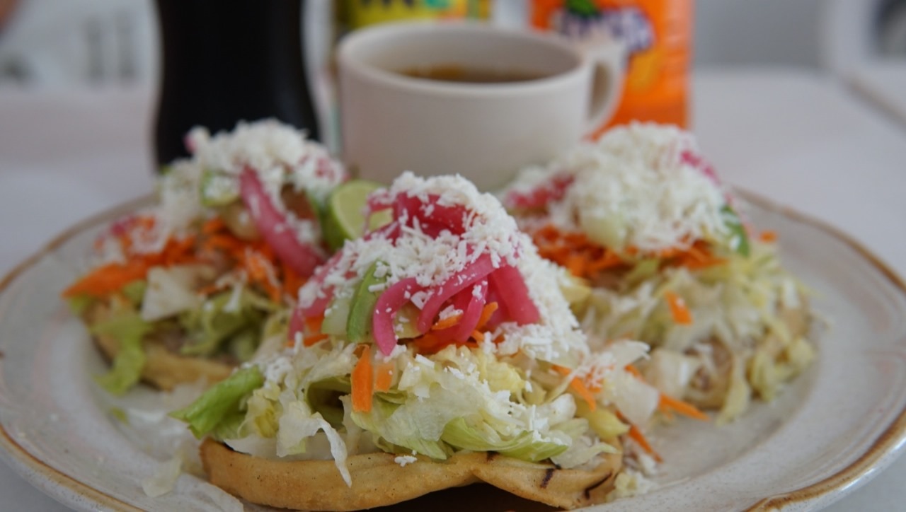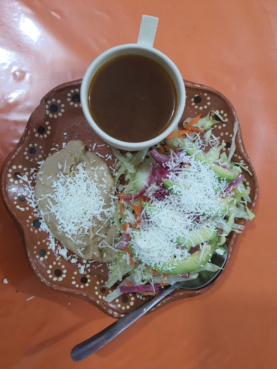 Sope de maíz frito con frijol, carne de res, lechuga, pepino, cebolla curtida, zanahoria, queso cotija y aguacate, acompañado de consomé de res.
