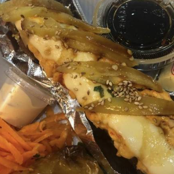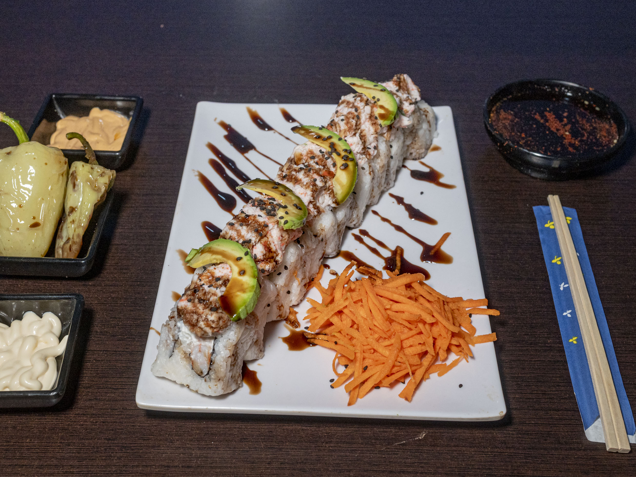 Chile relleno tampico fila, aguacate y salsa de anguila topping.