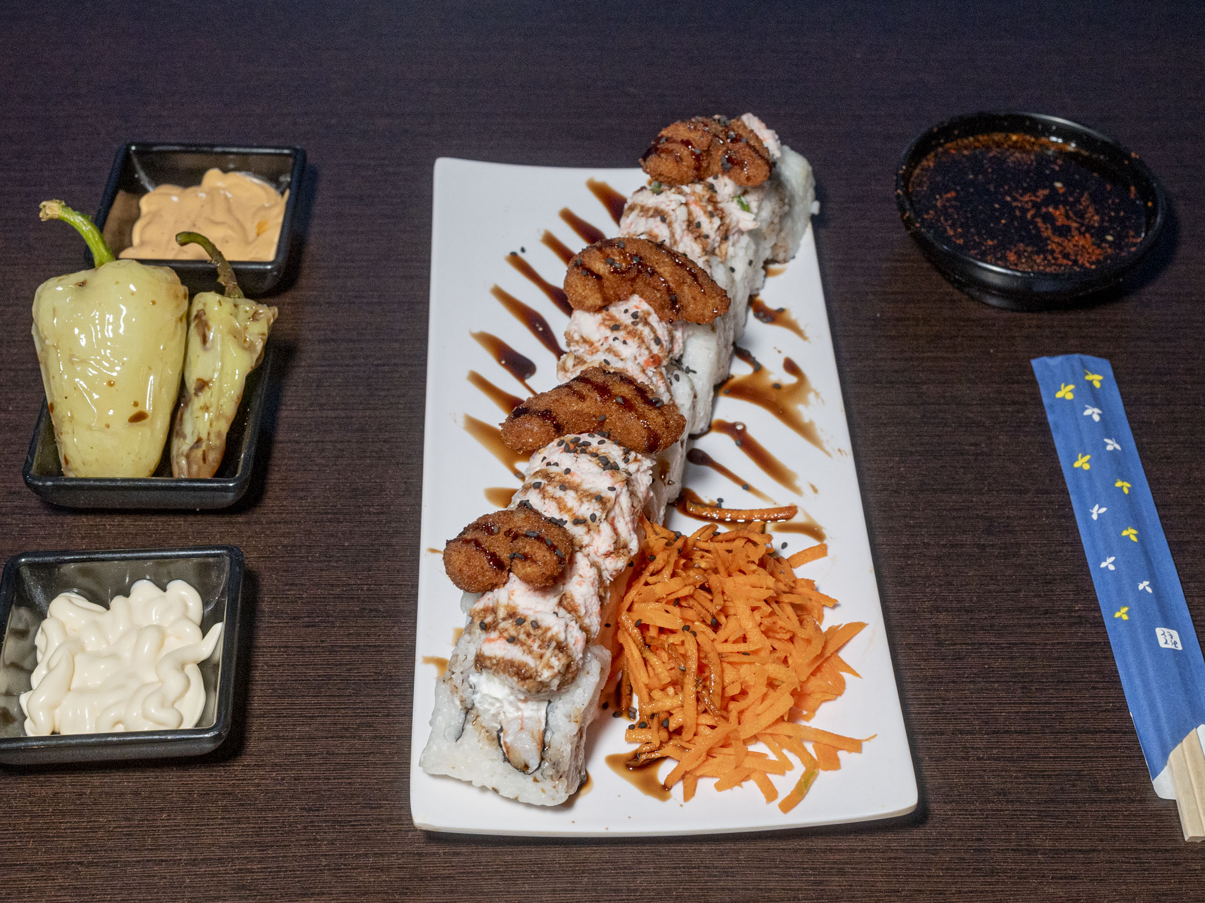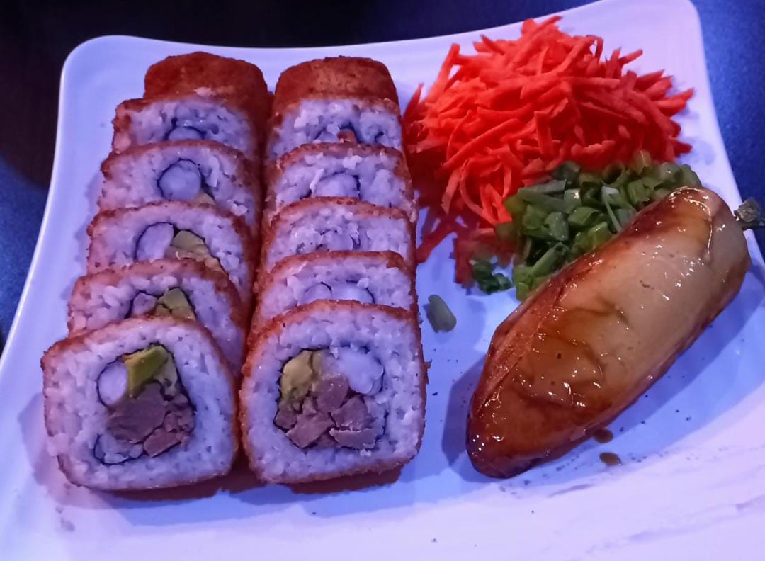 Philadelphia, aguacate y camarón capeado por dentro, tampico y camaron empanizado, topping bañado en salsa de anguila y ajonjolí.