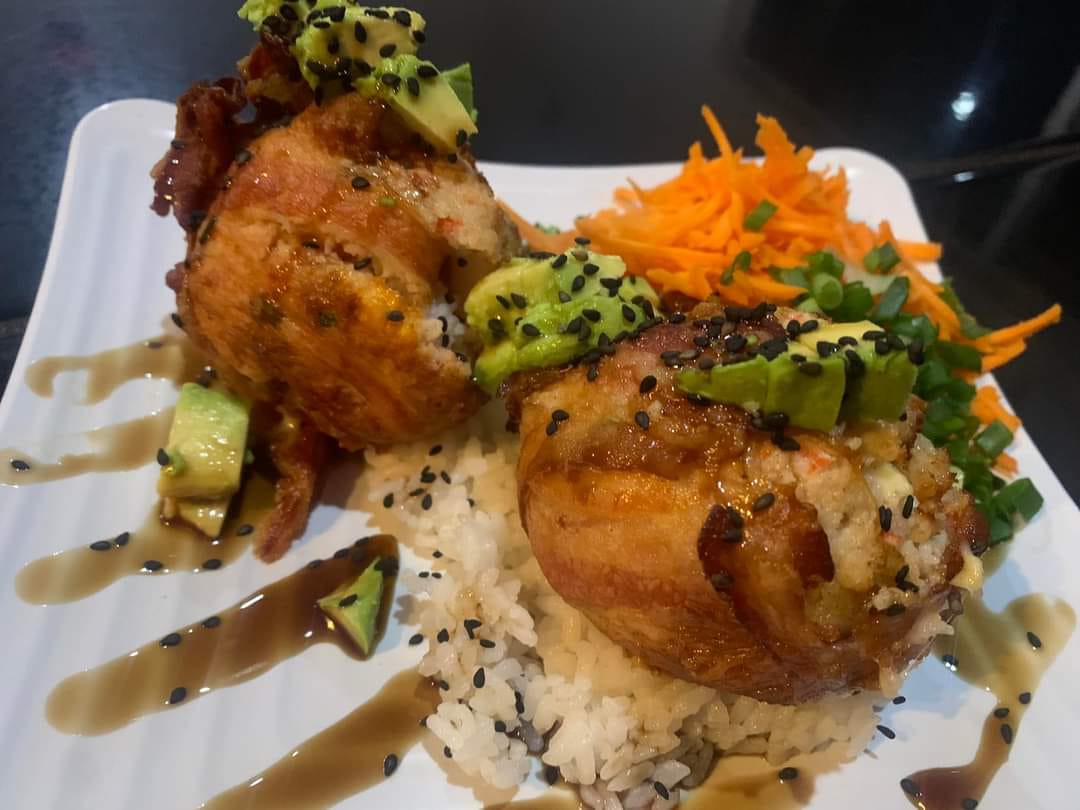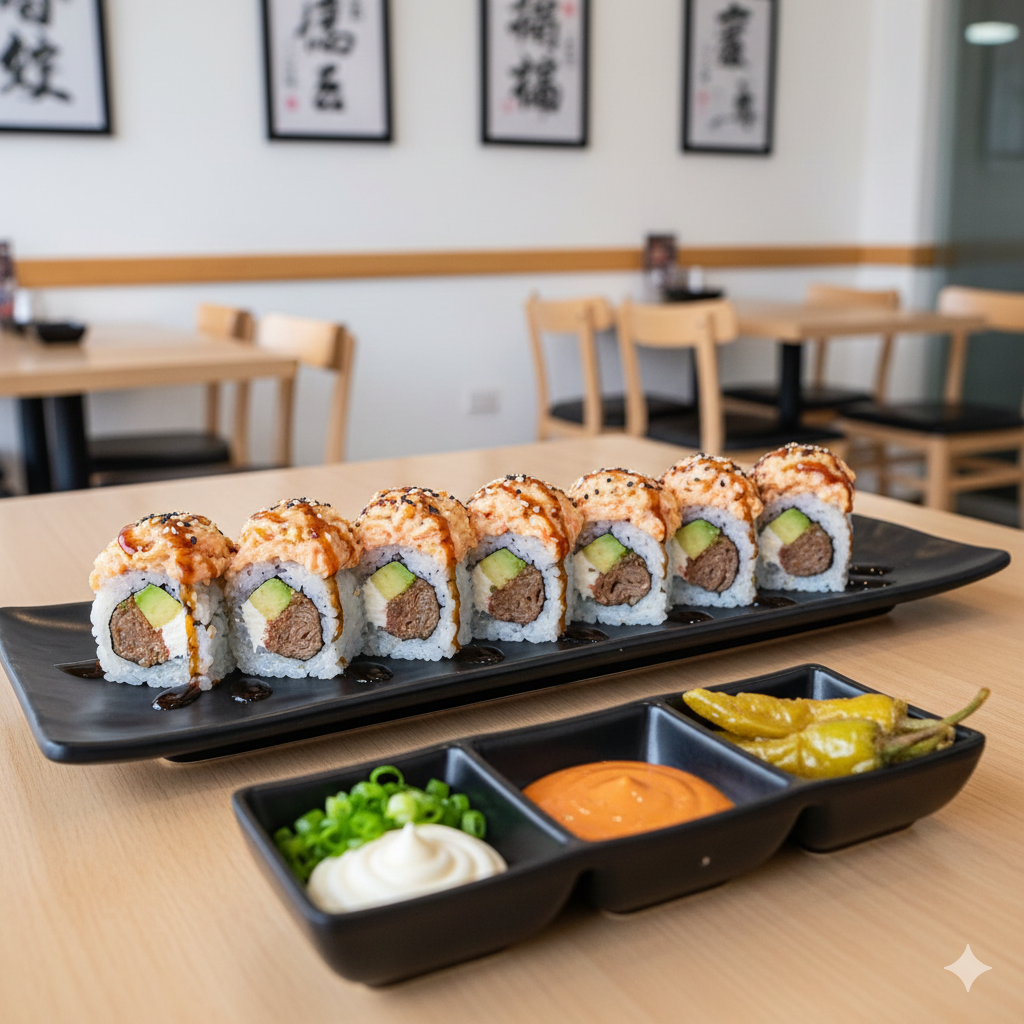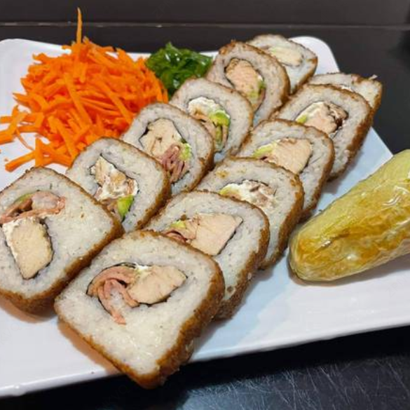 Camarón, pollo, tocino, res, fila y aguacate por dentro. Topping horneado, gratinado con Tampico, aderezo. Deliciosos trozos res y tocino, con un toque de sirasha, salsa anguila y ajonjolí.