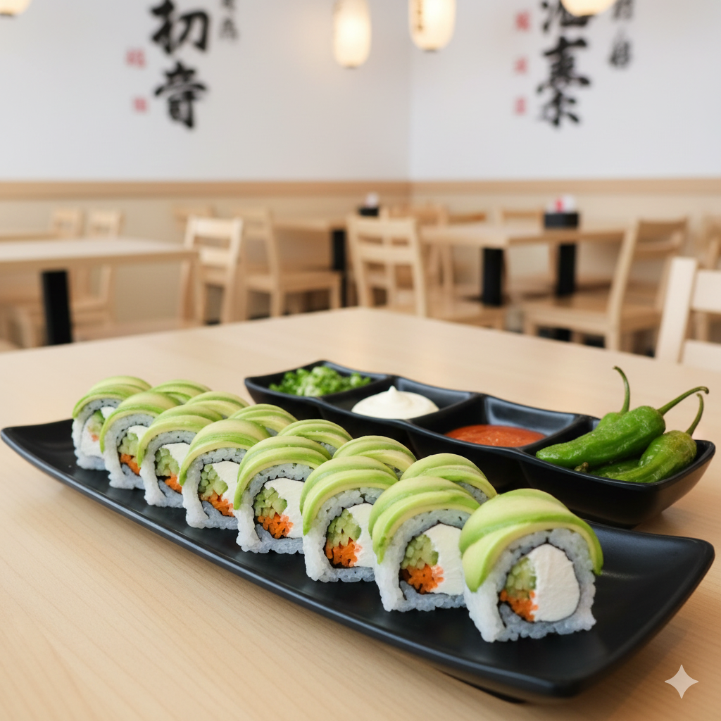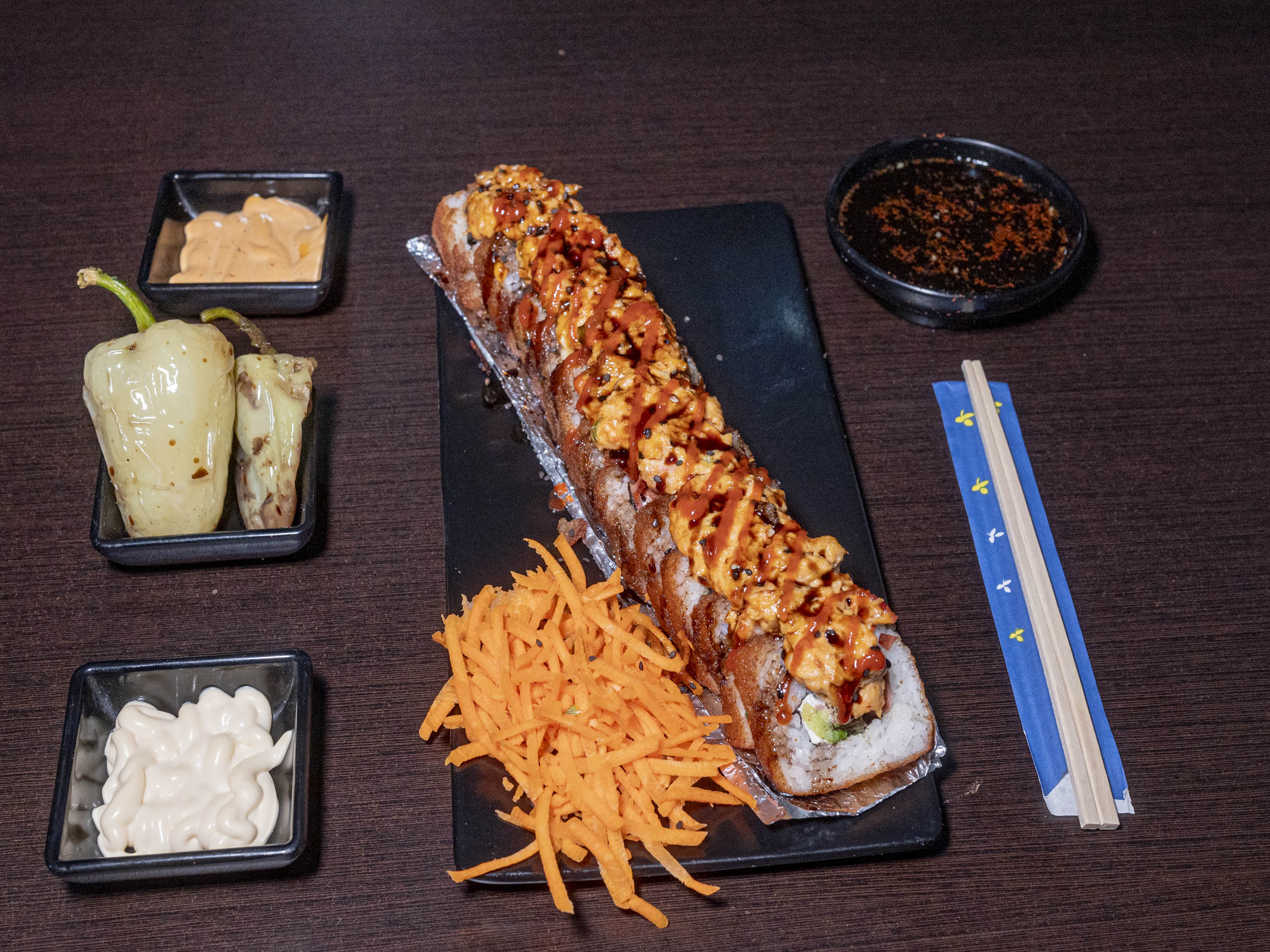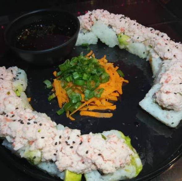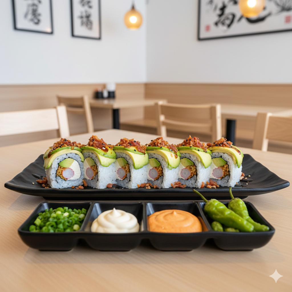 Philadelphia, aguacate, camarón empanizado por dentro, philadelphia, queso chihuahua, chile serrano y tocino por fuera, tampico, res, tocino, chile caribe, topping bañado en aderezo, salsa de anguila y ajonjolí. Platillo personal