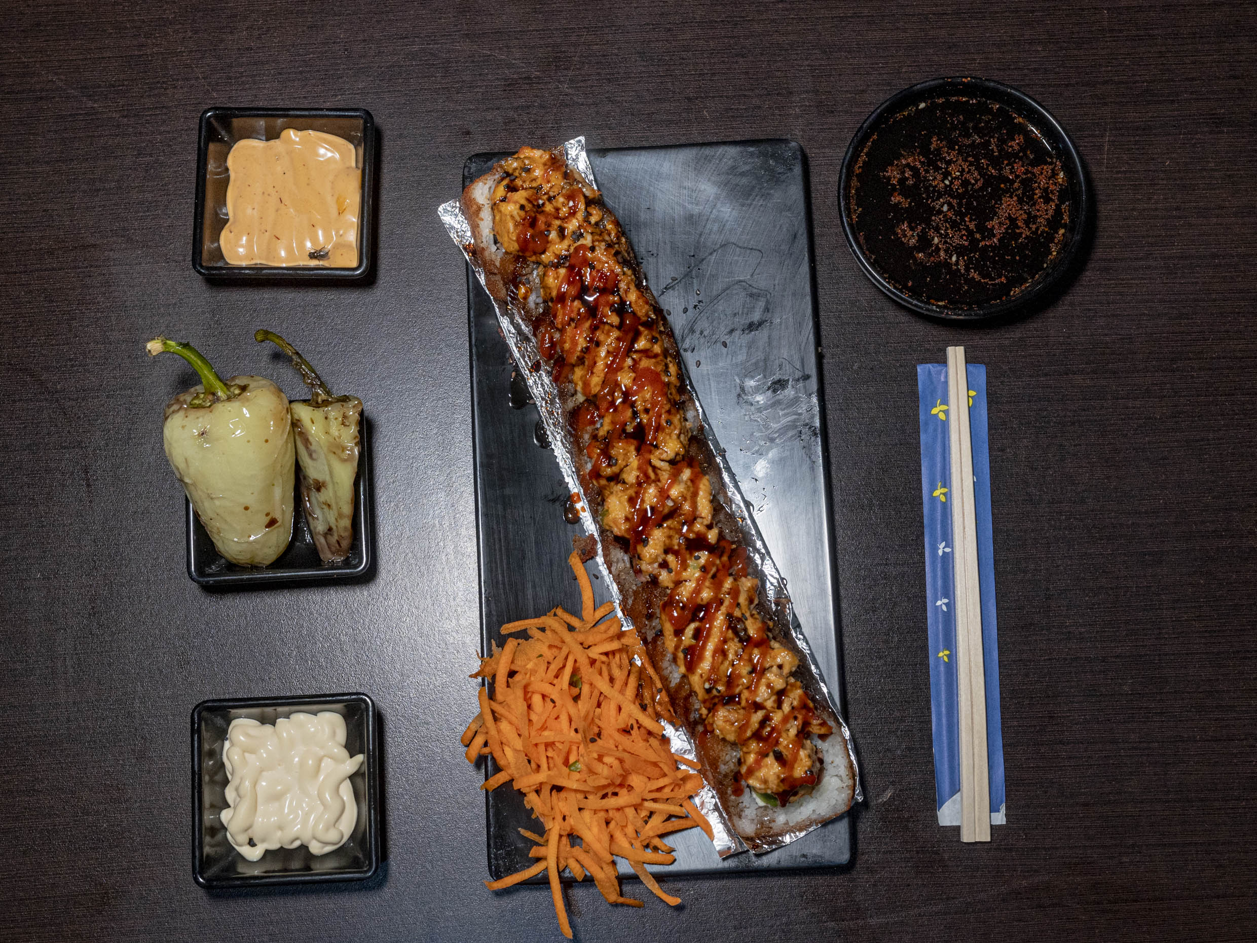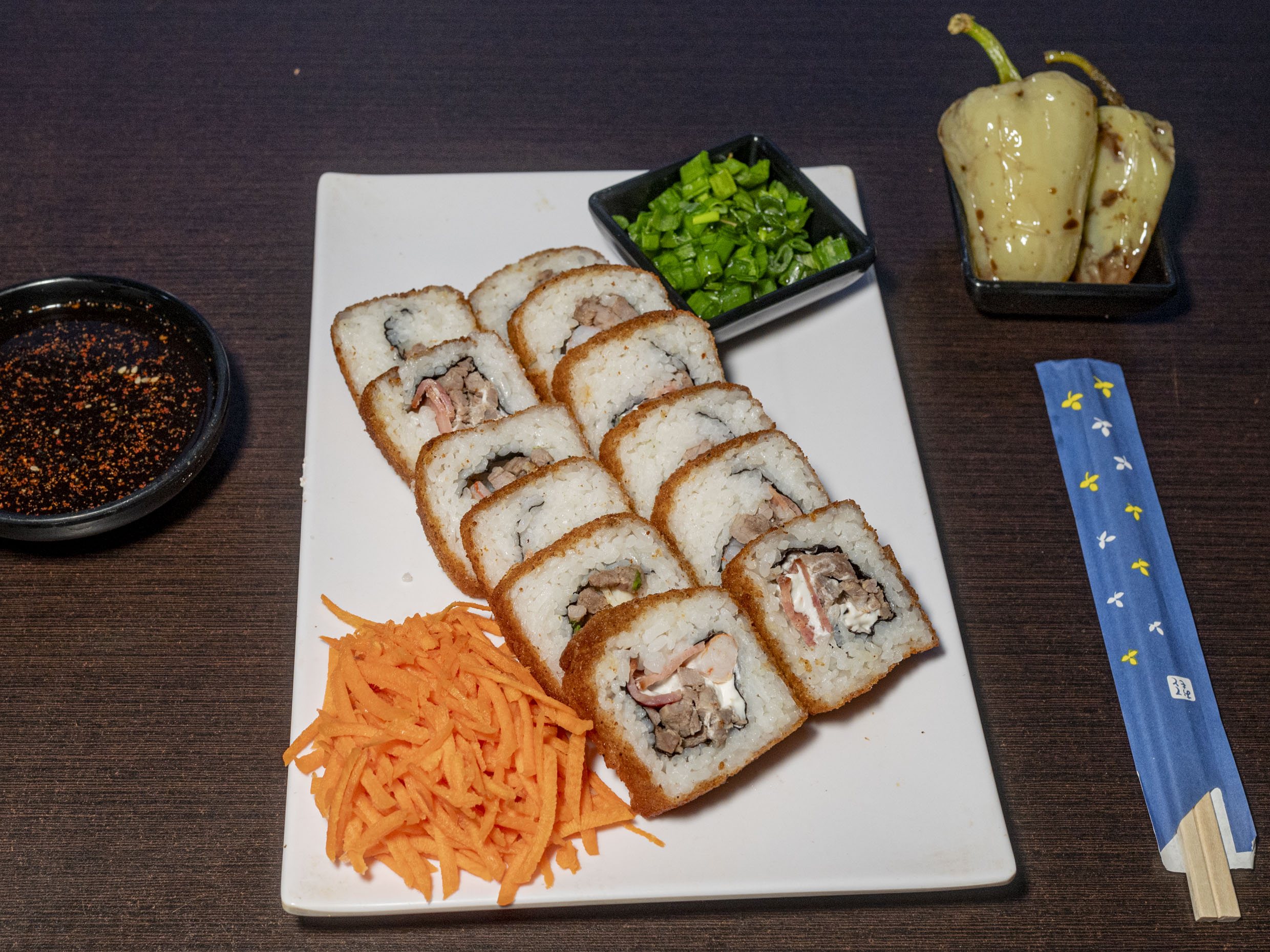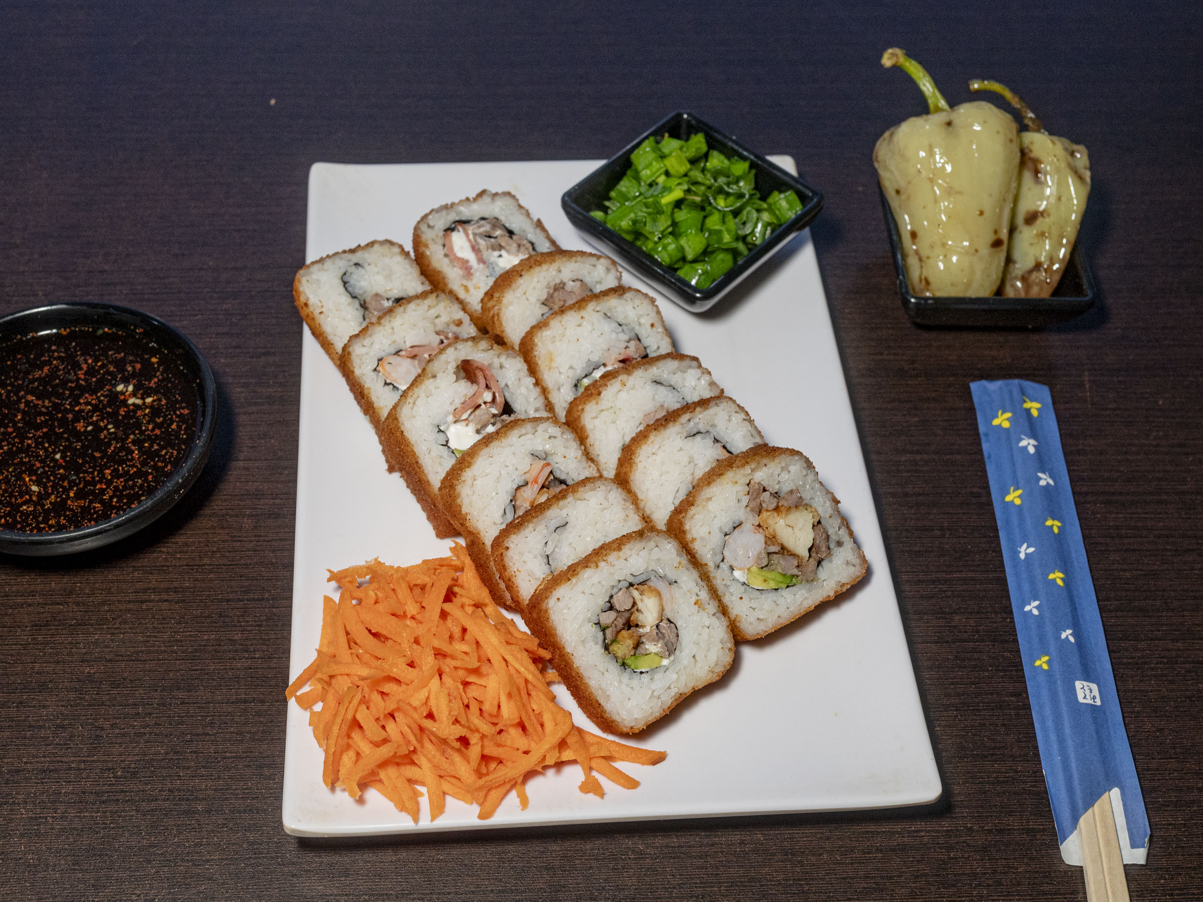 Philadelphia, aguacate, camarón empanizado por dentro, philadelphia, queso chihuahua, chile serrano y tocino por fuera, tampico, res, tocino, chile caribe, topping bañado en aderezo, salsa de anguila y ajonjolí. Platillo personal