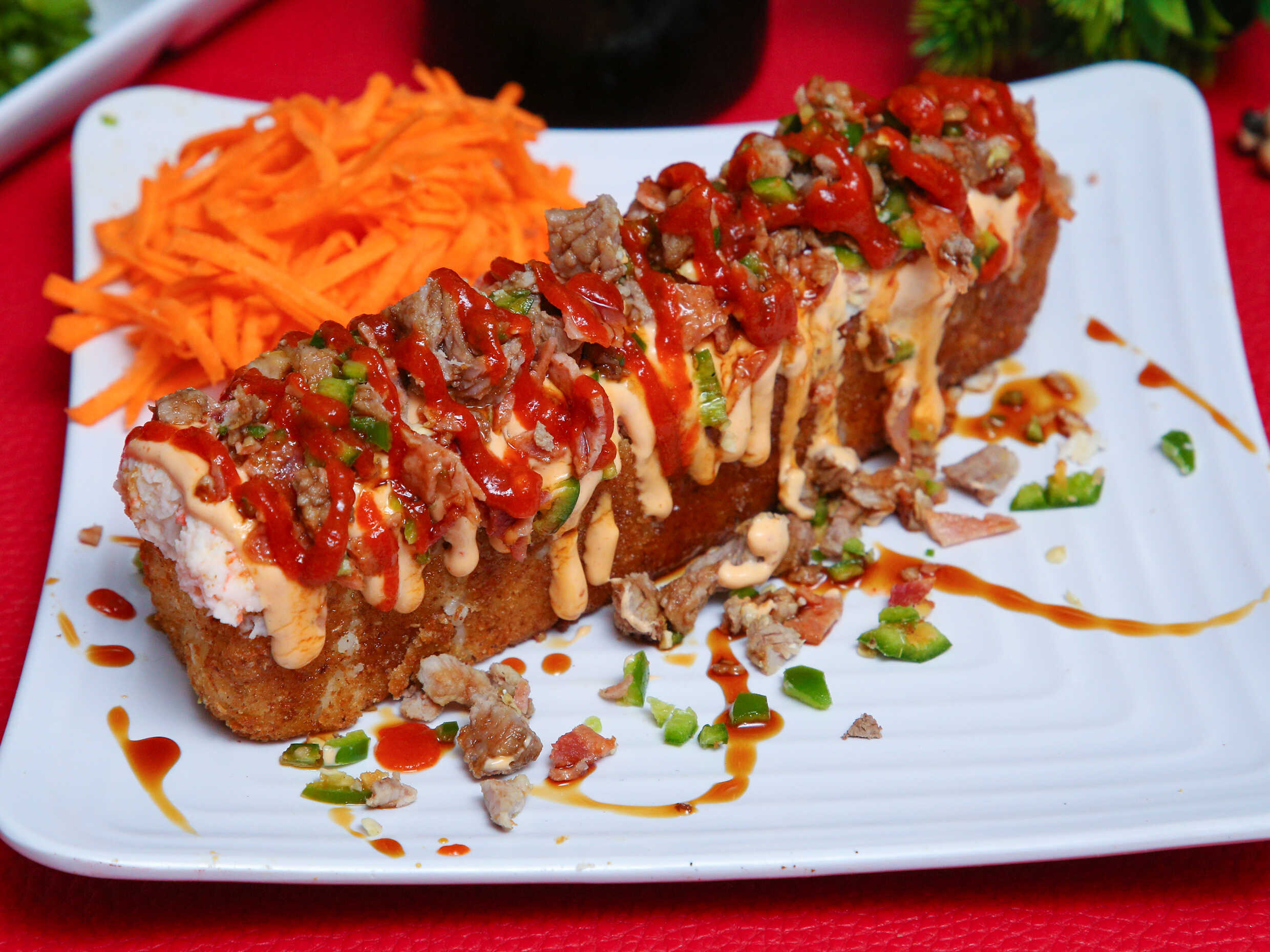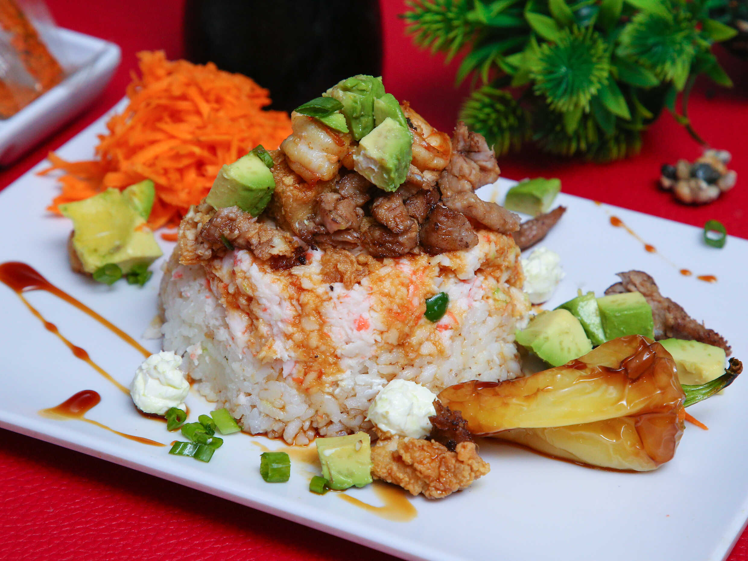 Cama de arroz empanizado con philadelphia, tampico, camaron, pollo, res, chile caribe picado, aguacate, topping, bañado en salsa anguila, derezo y sirasha.