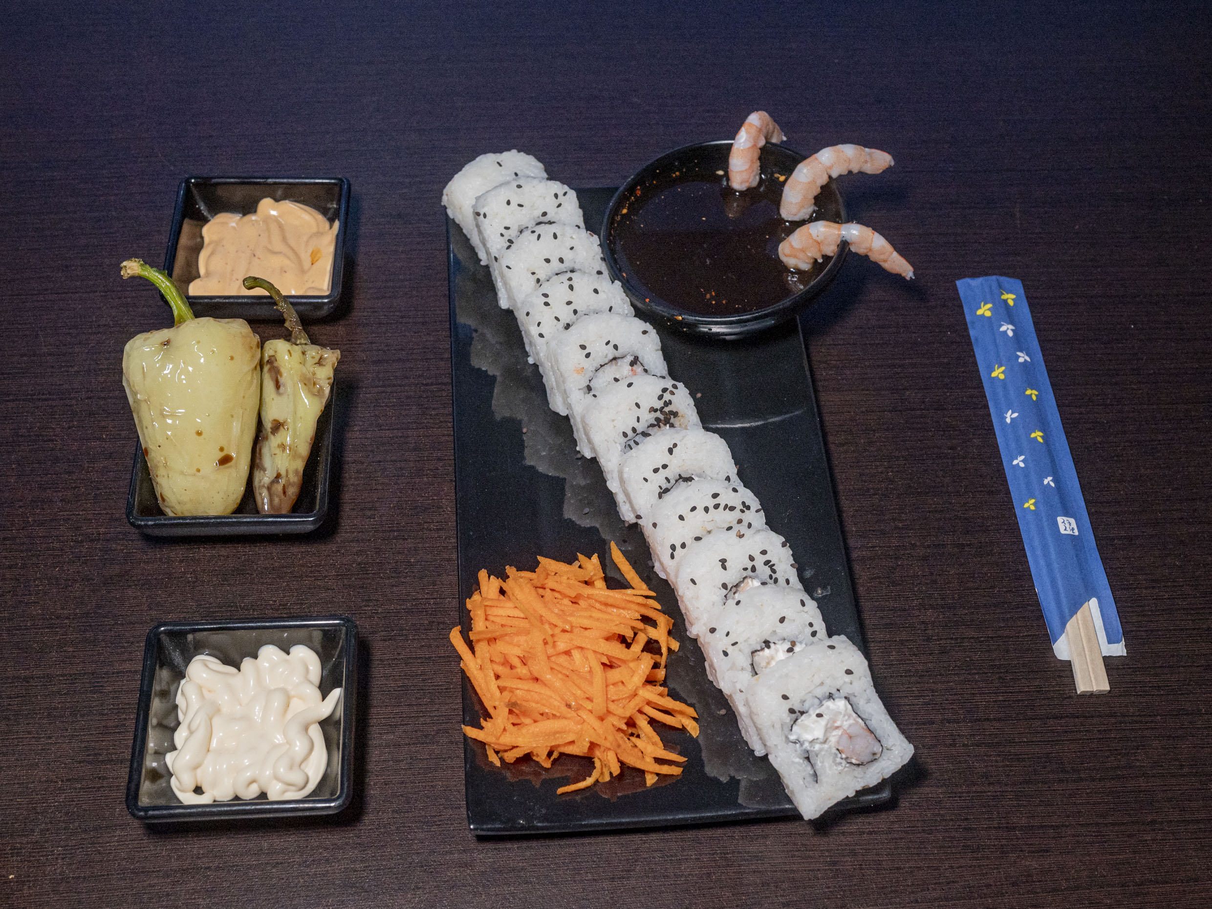 Philadelphia, aguacate, camaron y chile caribe por dentro, phladelphia y camarón por fuera.