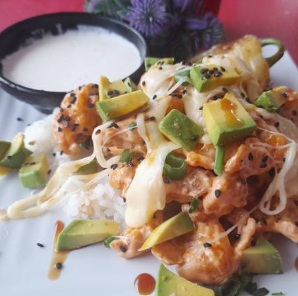 Arroz blanco con tampico, fila, pollo, cebolla en tempura, aguacate y salsa de anguila topping.