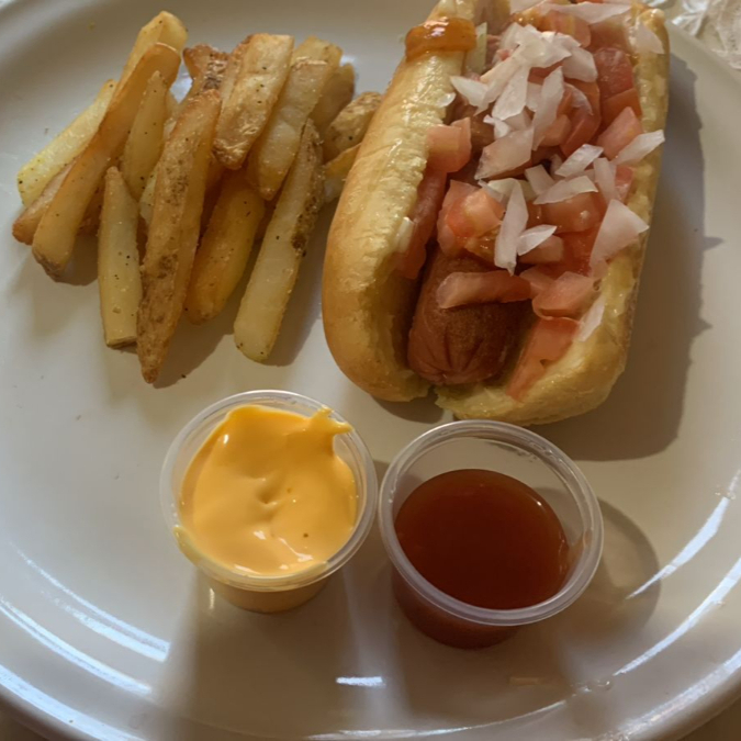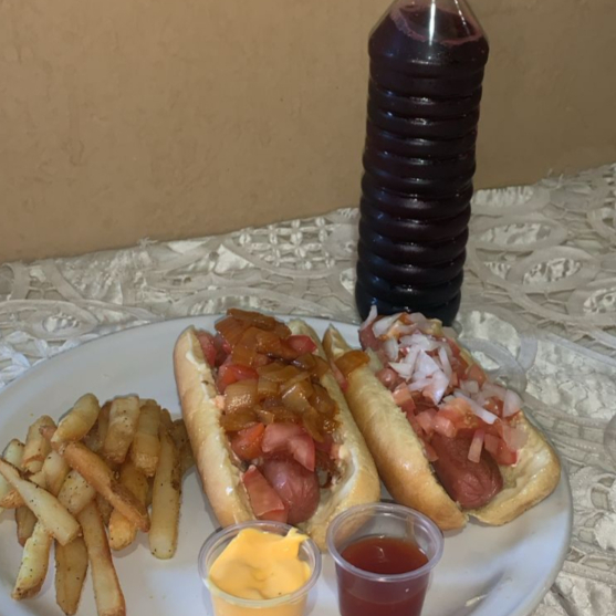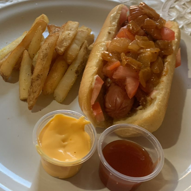 Hot Dog Especial Salchicha, Tocino, Jamón, Queso americano, Tomate, Cebolla, mayonesa C/papas a la francesa