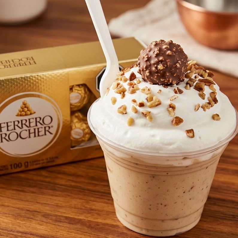 Fresas FERRERO ROCHER EXQUISITA CLAMA SABOR FERRERO ROCHER CON TROZOS DE NUEX Y CHOCOLATE CON AVELLANA UN TOQUE DE NUESTRA DELICIOSA CREMA DULCES CORONADO CON CREMA BATIDA Y UN CHOCOLATE FERRERO ROCHER