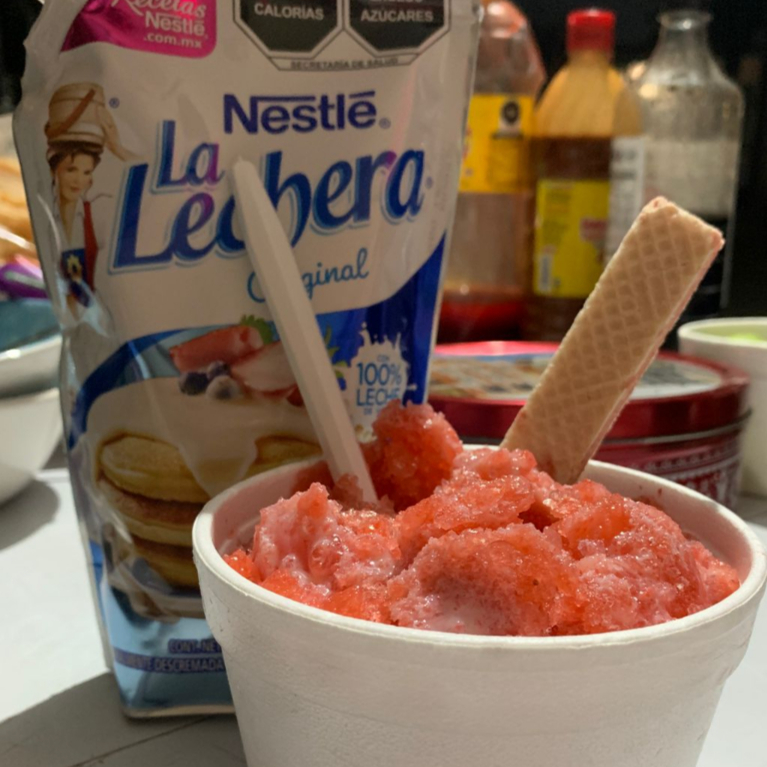 Delicioso Helado de fresa natural endulzado con un esquisito toque de Lecherita acompañado de una galleta de crema de fresa 🍓