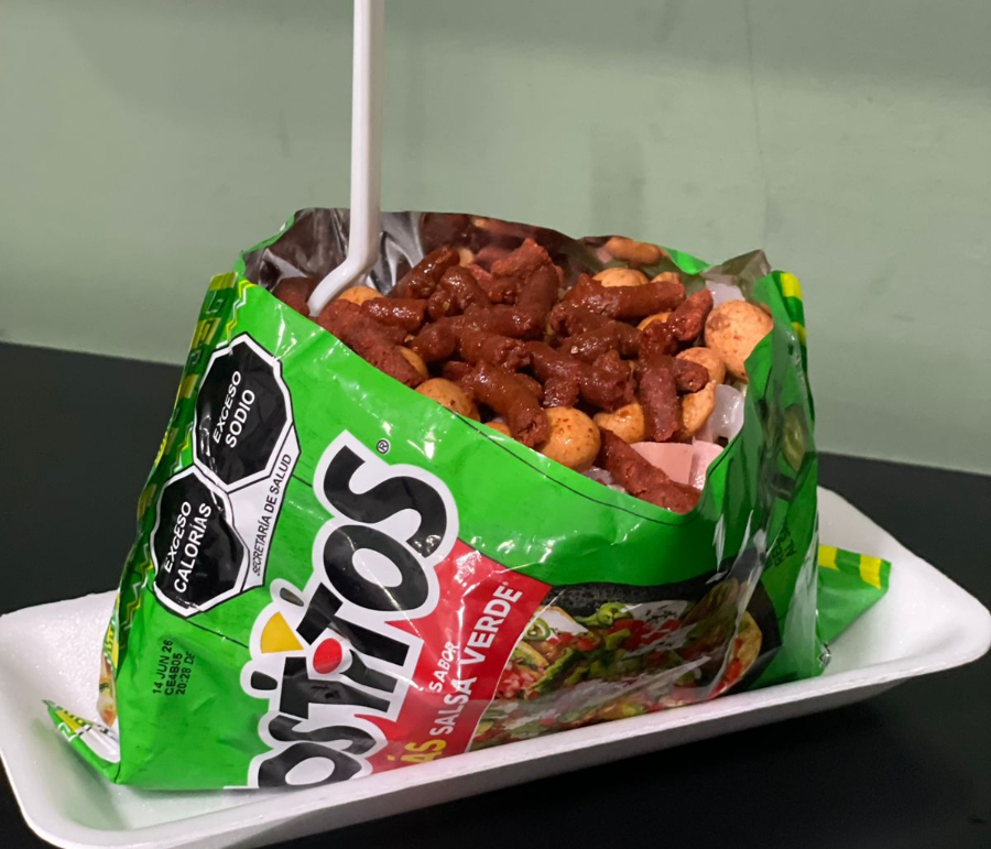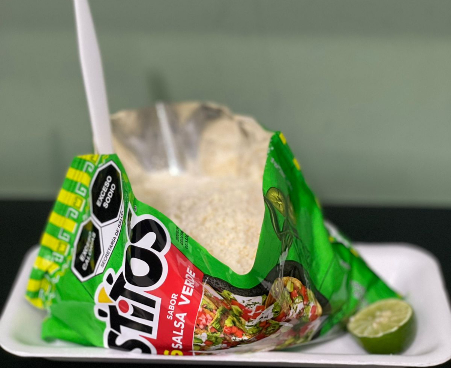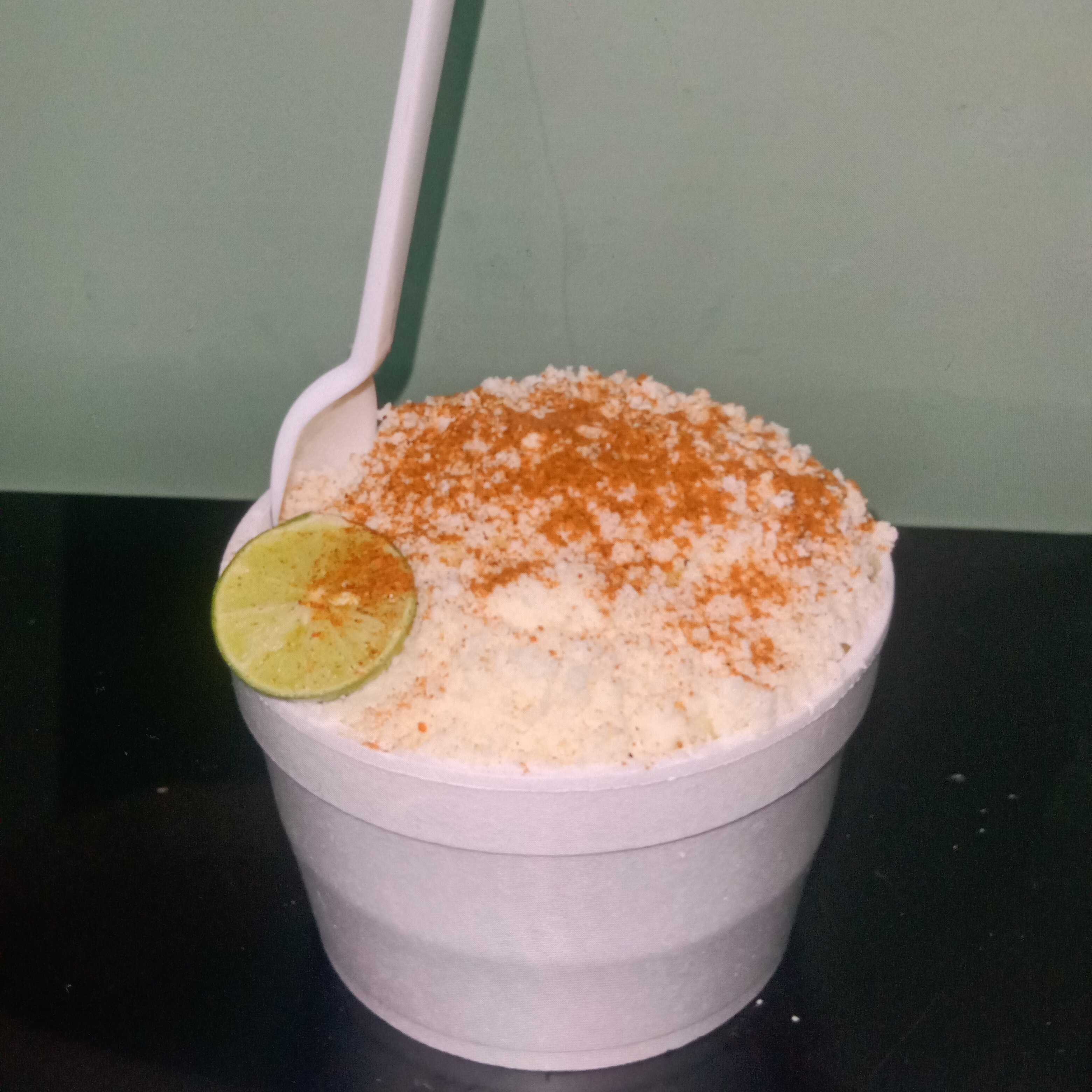 Deliciosa combinación de elote desgranado con crema, queso y tostitos.