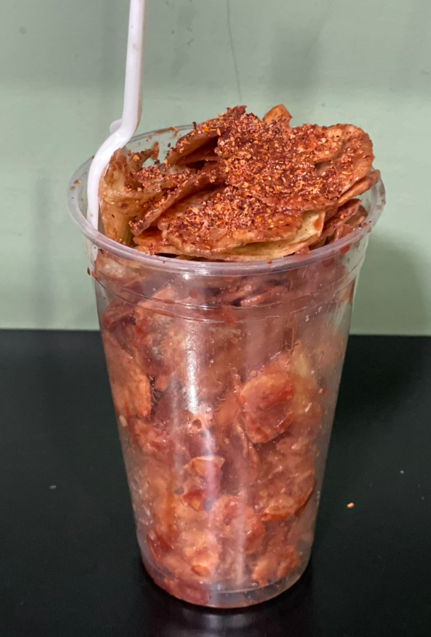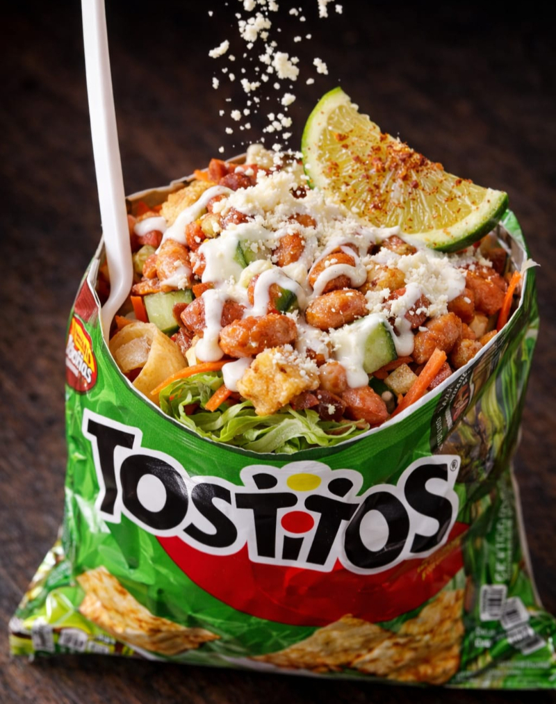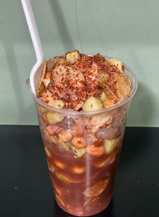 Combinación de Tostitos con pepino, salchicha, cuerito, cacahuate, realito y clamato preparado.