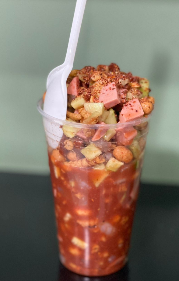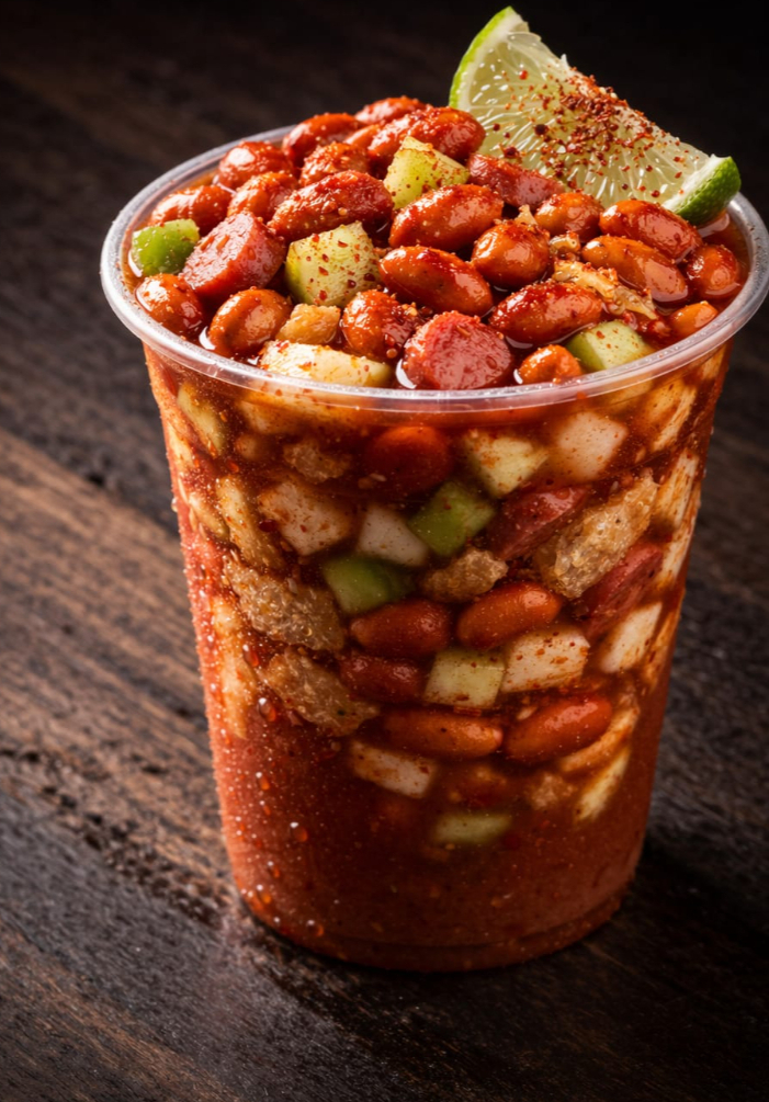 Vaso de 16 oz con cacahuates, pepino, salchicha, cuerito, realito y clamato preparado.
