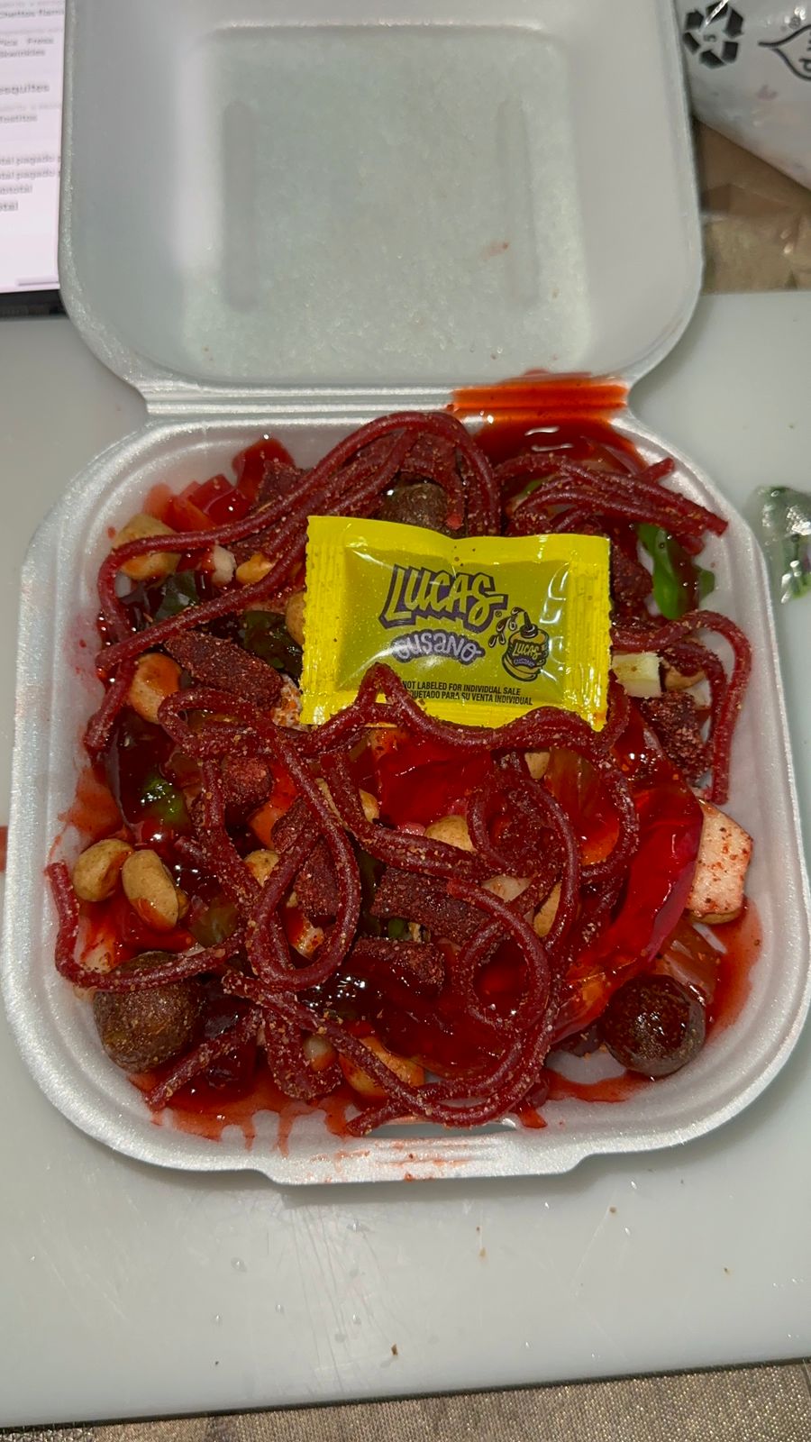 Trozos de manzana, banderilla, serpentina, gomitas de pandita y gusano, cacahuate y realito y salsa de la casa.