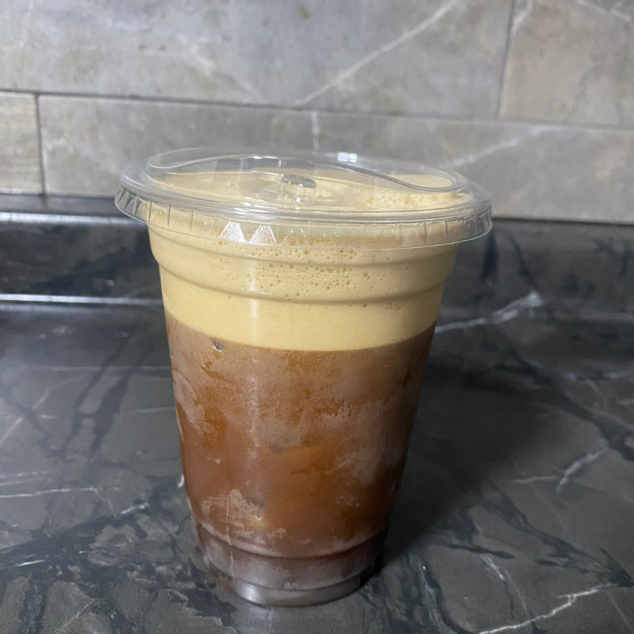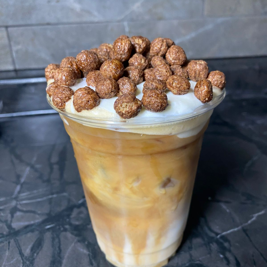 Café, hielo, leche ,crema especial de la casa, topping cereal Cocoa Puffs