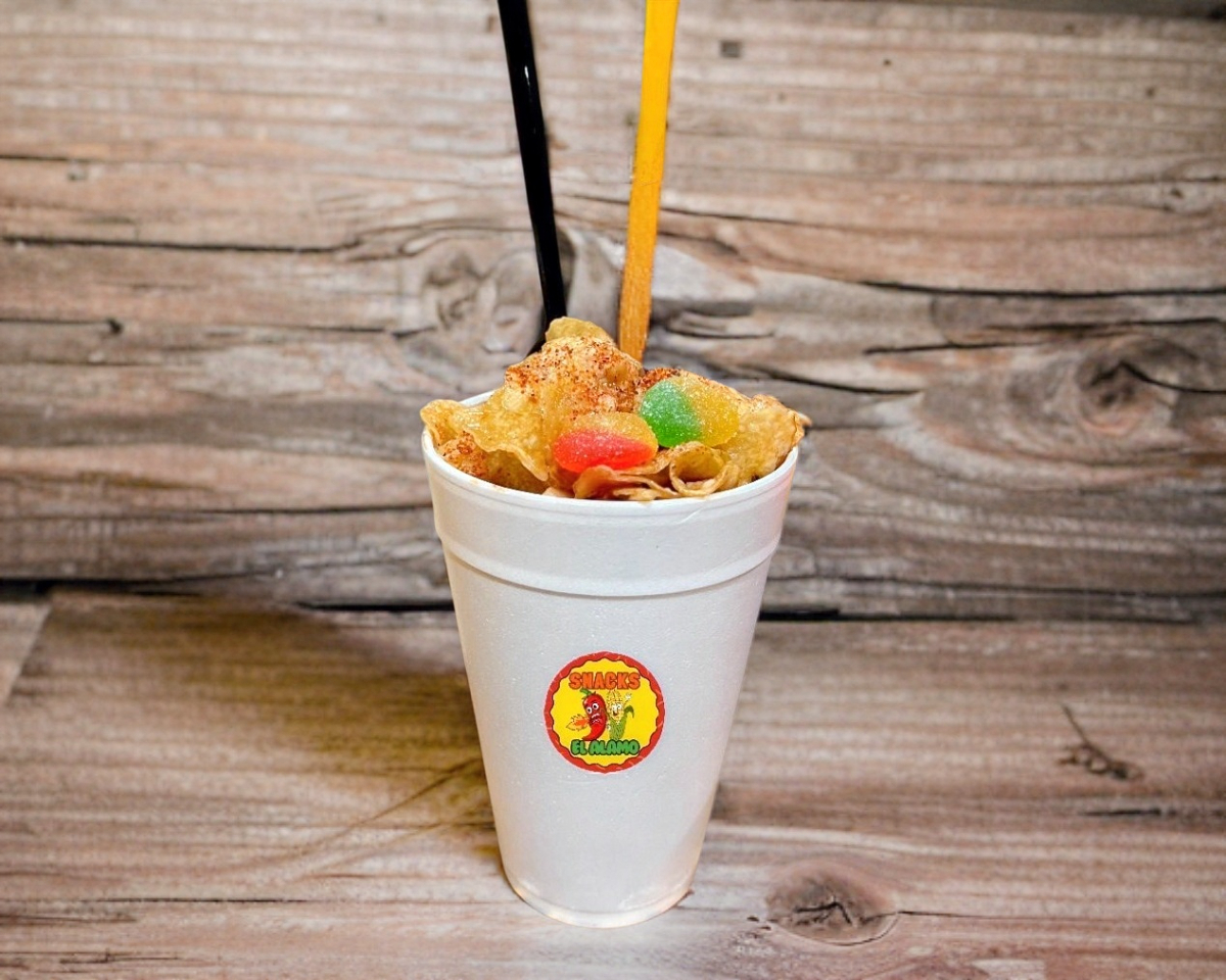 Churros, Pepino, Salchicha, Cueritos, Jícama, Cacahuate, Realito, Clamato y Salsas negras.
