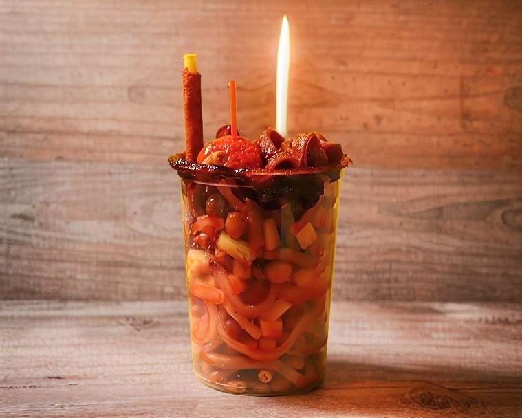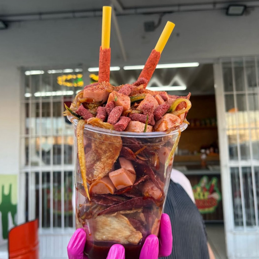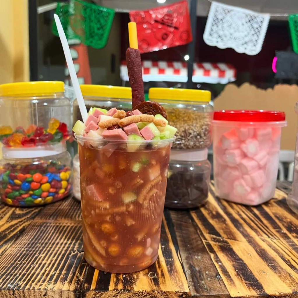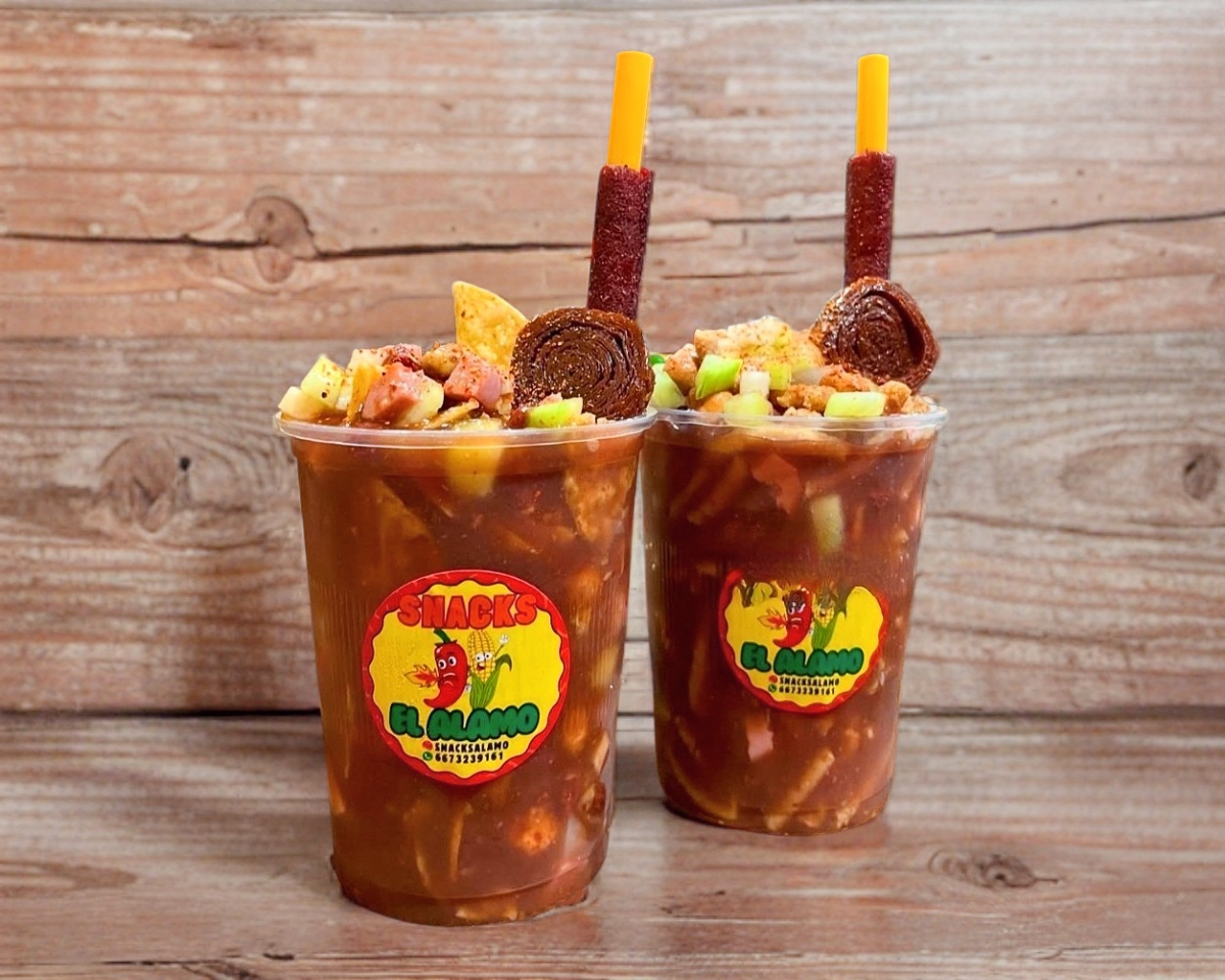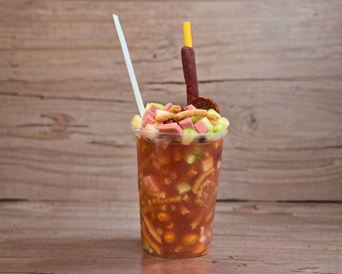 Cacahuate Japonés, Pepino, Salchicha, Cuerito, Jícama, Realito, Clamato y Salsas de la casa.