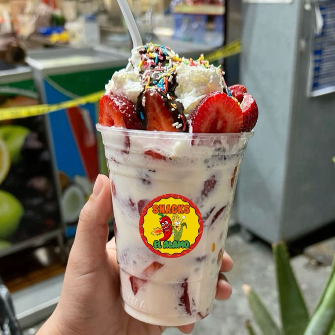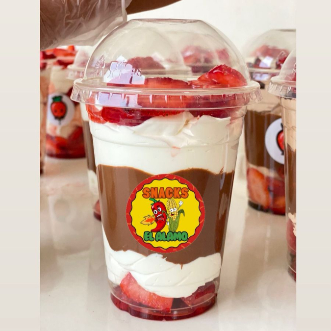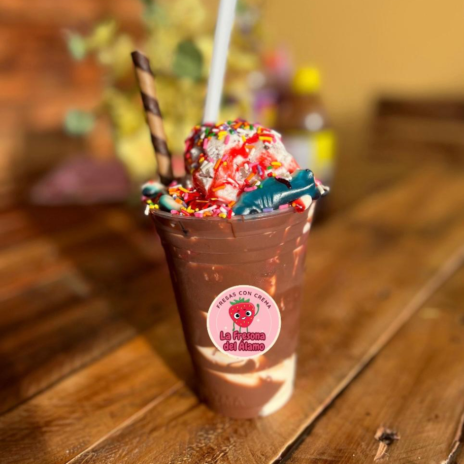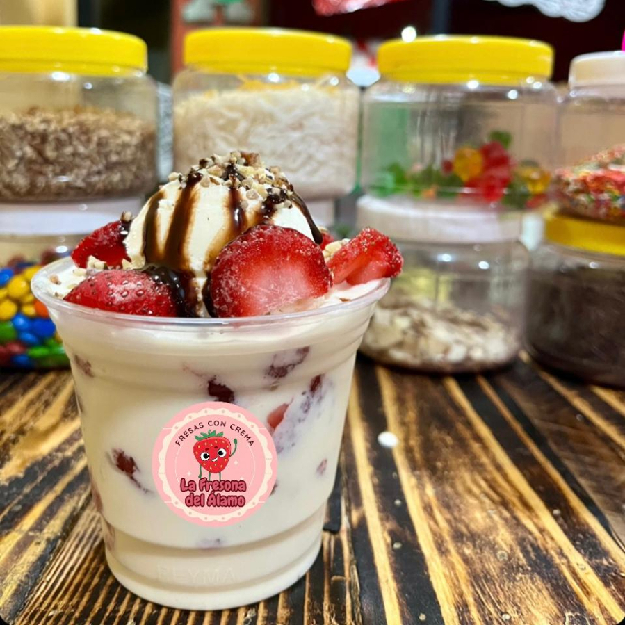 Fresa natural congelada, Crema de la casa, 1 Topping a elegir y 1 Jarabe a elegir.