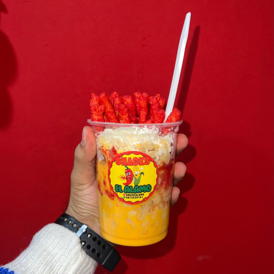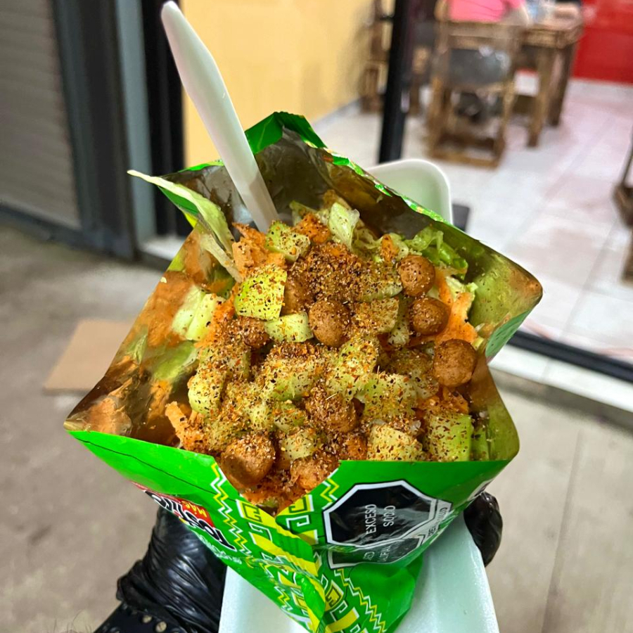 Sabritas a elegir, Pepino, Salchicha, Jícama, Cueritos, Cacahuate, Realito, Clamato y salsas de la casa.