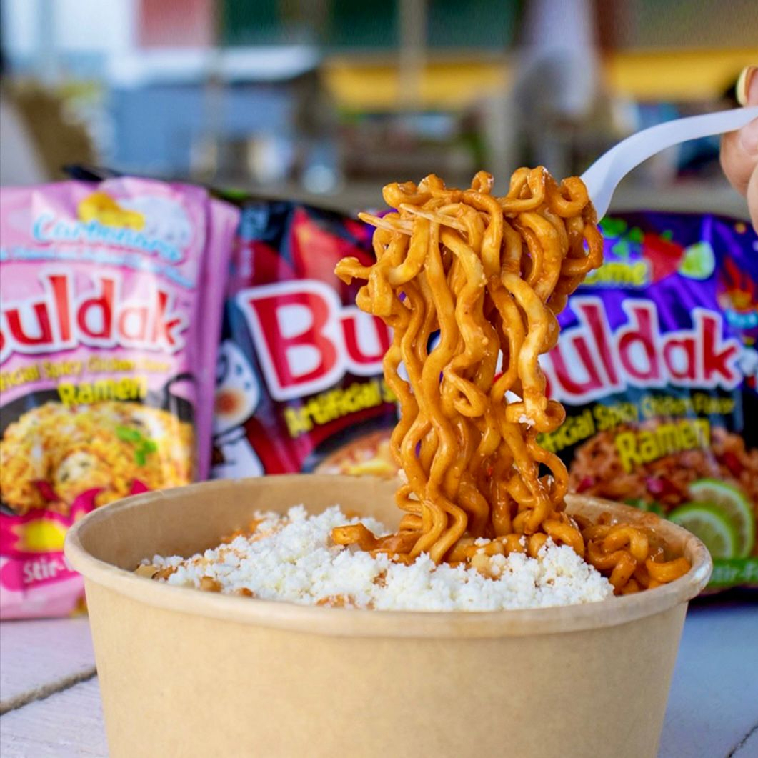 Ramen Buldak a elegir, Esquite, Crema, Chipotle y Queso Cheddar.