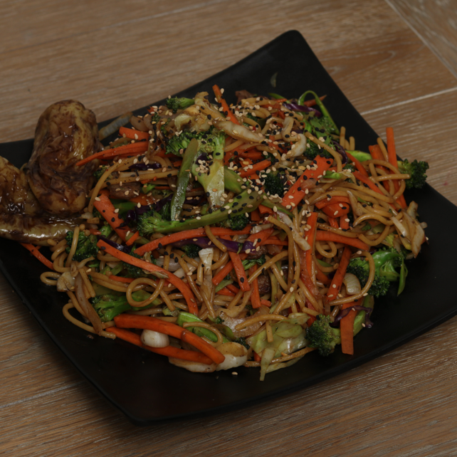 Fideos y verduras salteadas acompañado con carne de res