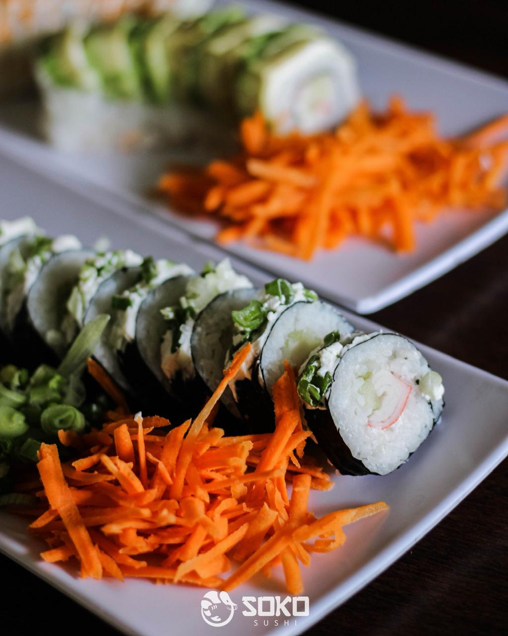 Pepino, zanahoria y aguacate por dentro. Todos los rollos llevan Philadelphia y pepino por dentro.