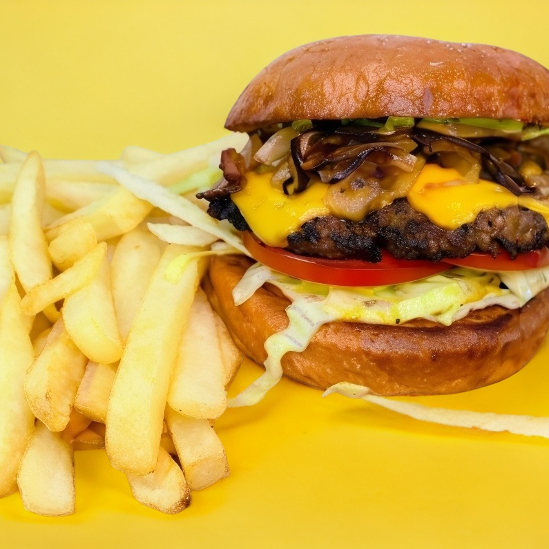 Doble carne de res de 90 grs, doble queso americano, bañada en queso cheddar, tomate, cebolla caramelizada, lechuga y aderezos acompañada de 250 grs. de papas.