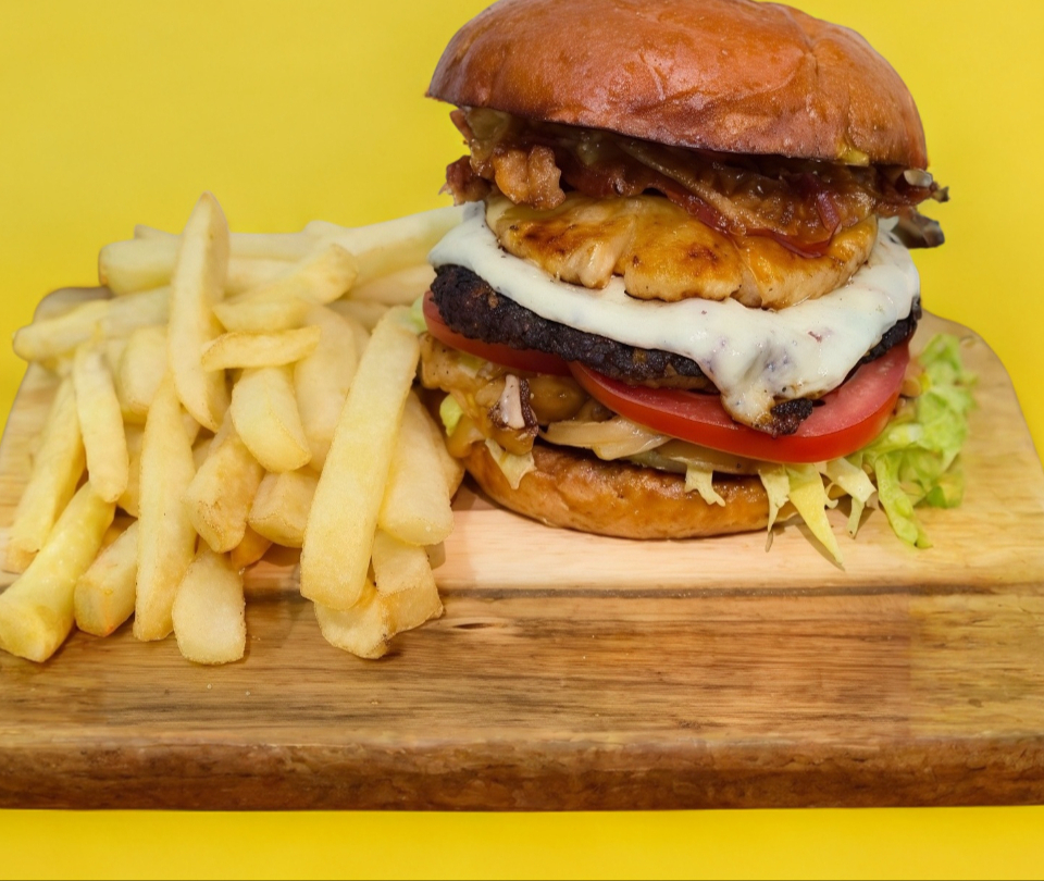 90 grs. de carne de res, queso mozarella, piña asada, tomate, cebolla caramelizada, lechuga y aderezos acompañada de 250 grs. de papas