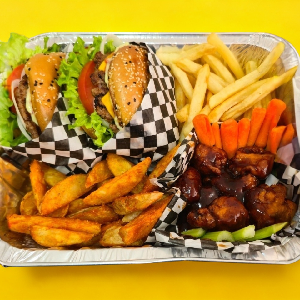 2 hamburguesas americanas, 250 grs, de boneless acompañado de verduras frescas, 250 grs de papas gajo, 250 grs de papas a la francesa.