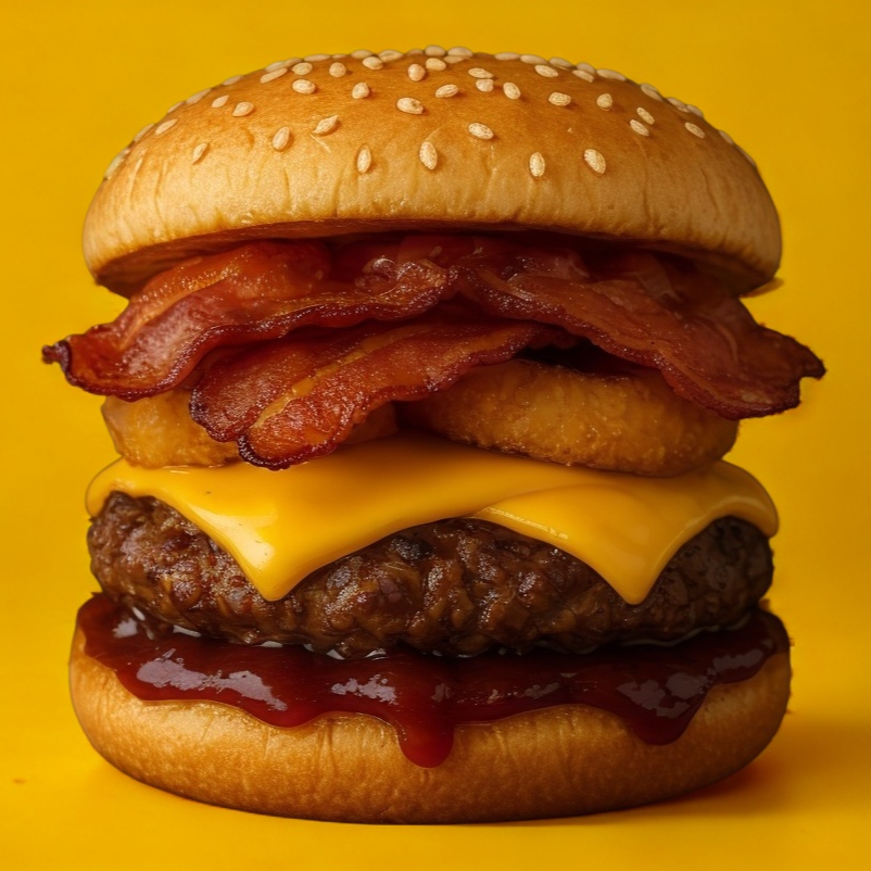 Pan, 150 grs. de carne asada a la plancha, doble queso americano, doble tira de tocino, base de cebolla caramelizada, aros de cebolla bañados en salsa BBQ.