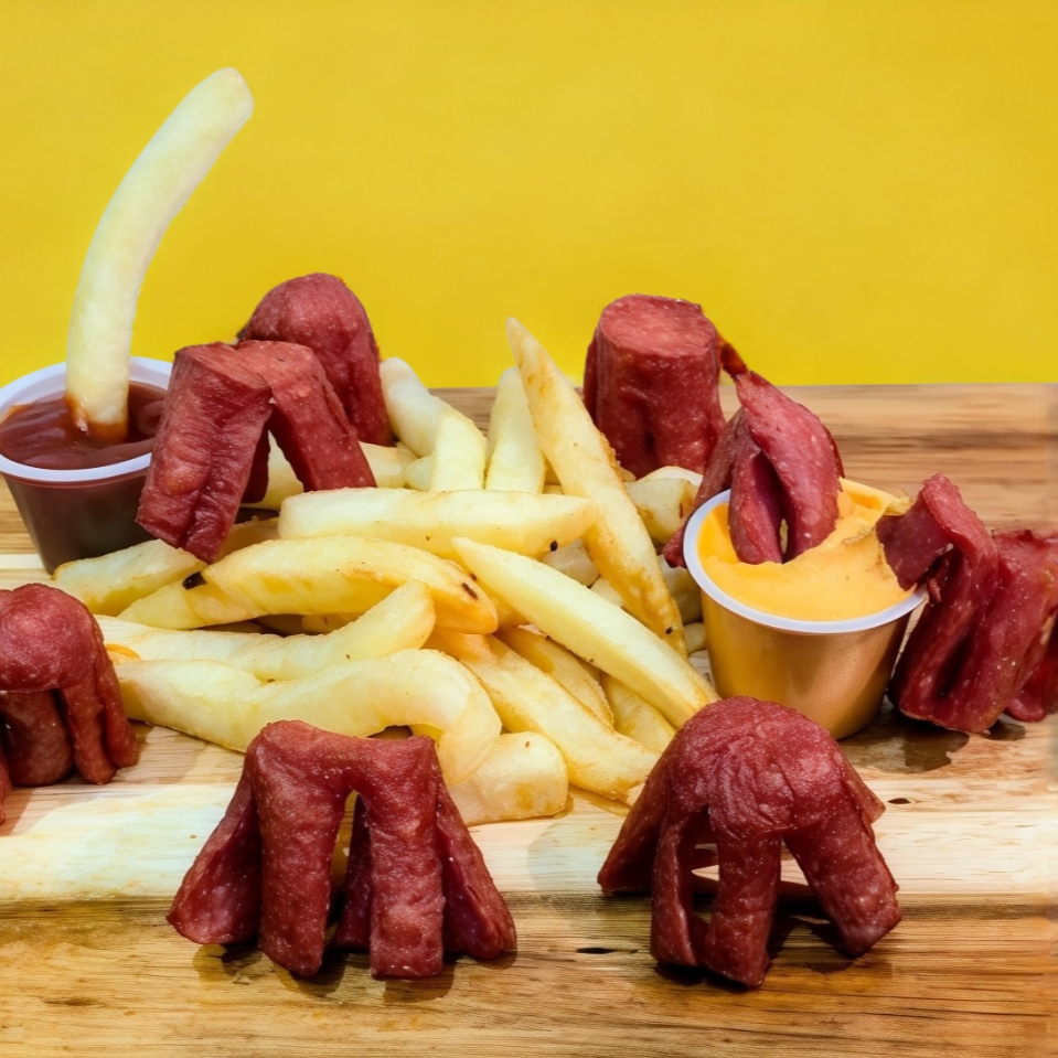 200 grs de papas a la francesa con trocitos de salchicha.