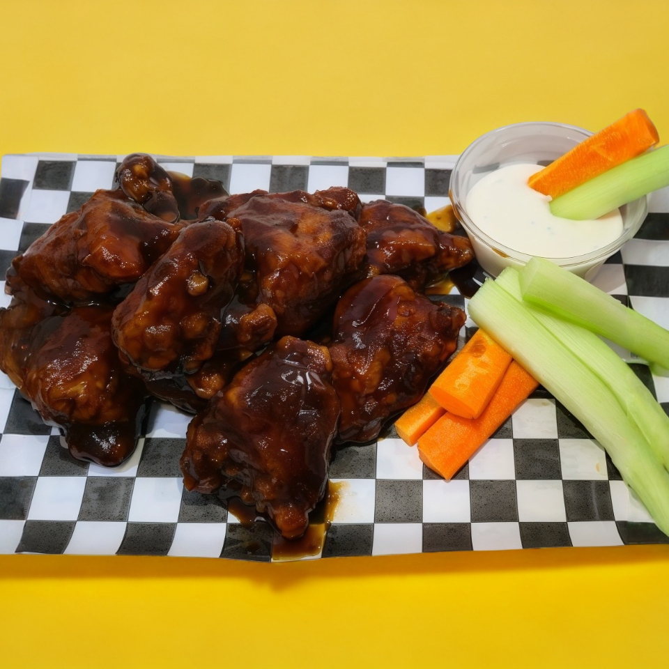 250 grs. de pollo crujiente bañados con la salsa de tu preferencia, acompañado de ranch y vegetales frescos
