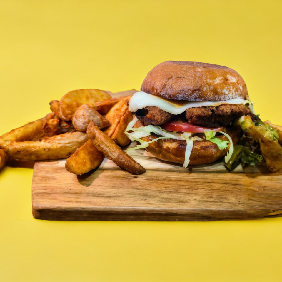 Pan casero , 150 gr. carne de res , doble queso americano, cebolla caramelizada, verduras frescas del día, acompañada de 250 grs, de papas.