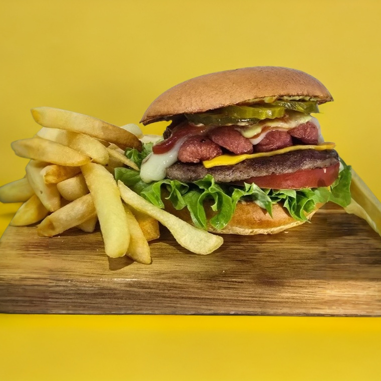 Pan casero, 90 grs de carne de res, doble queso americano, salchicha de pavo bañado en queso mozarella, cebolla caramelizada, tomate, lechuga, aderezos de la casa, acompañada de 250 grs. de papas a la francesa.