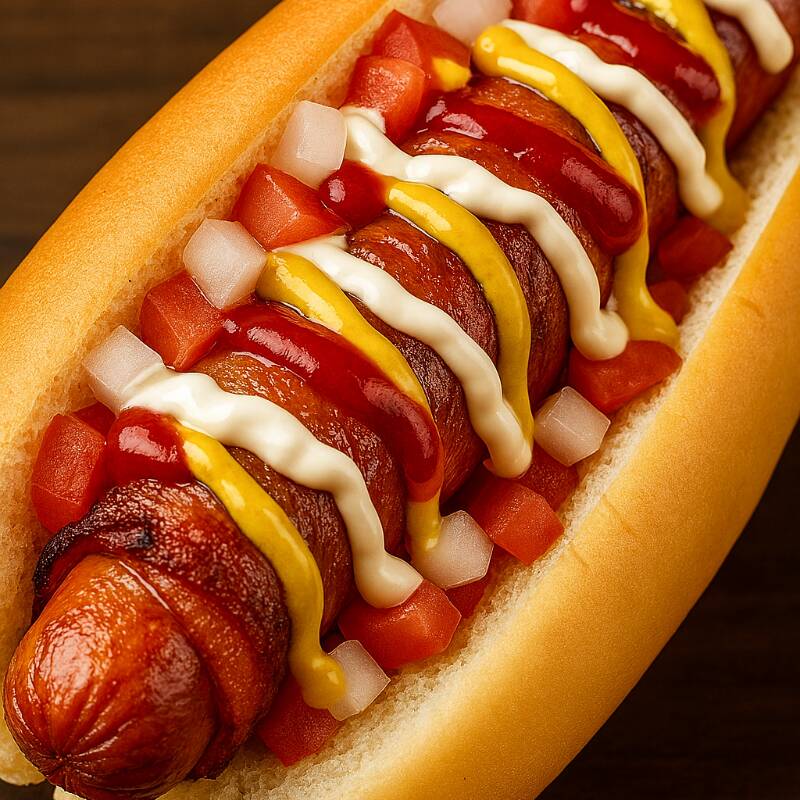 Pan Brioche, Salchicha Jumbo, tocino, Jamon, Queso Americano, Queso Mozarella, tomate, cebolla, acompañado de 200 grs. de papas