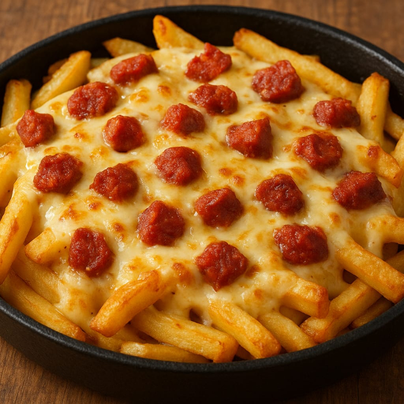 Deliciosas papas a la francesa crujientes y doraditas, bañadas con queso mozarella y coronadas con chorizo (Chistorra)