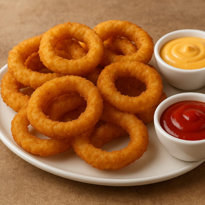deliciosos aros de cebolla frescos, empanizados y fritos hasta alcanzar una textura crujiente, acompañado de sus aderezos, catsup y BBQ