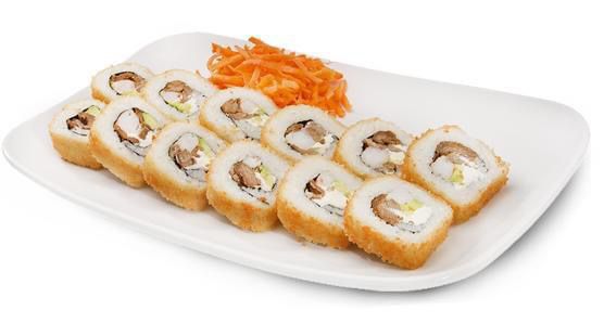 Rollo empanizado con Philadelphia, pepino, aguacate, pollo y tocino por dentro. Por fuera topping de camarón bañado en salsa de anguila.