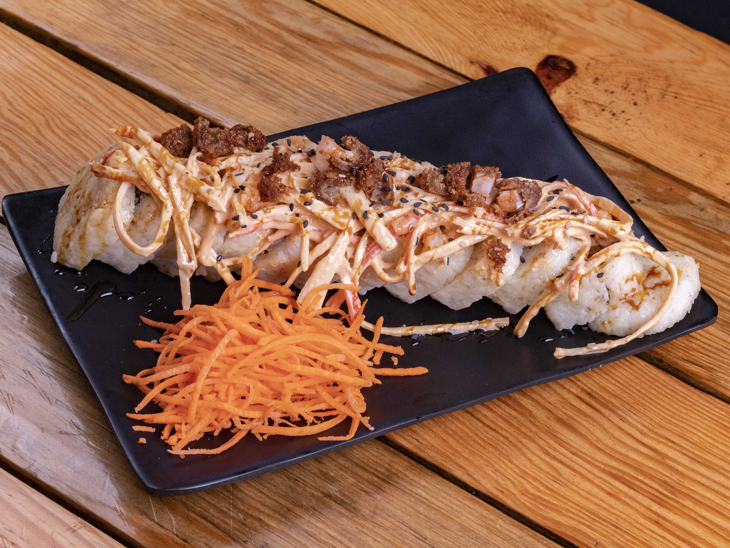 Philadelphia, pepino, aguacate, camarón por dentro. Por fuera mechas de cangrejo, spicy, cebollín, coronado con camarones empanizados, salsa de anguila y ajonjolí.