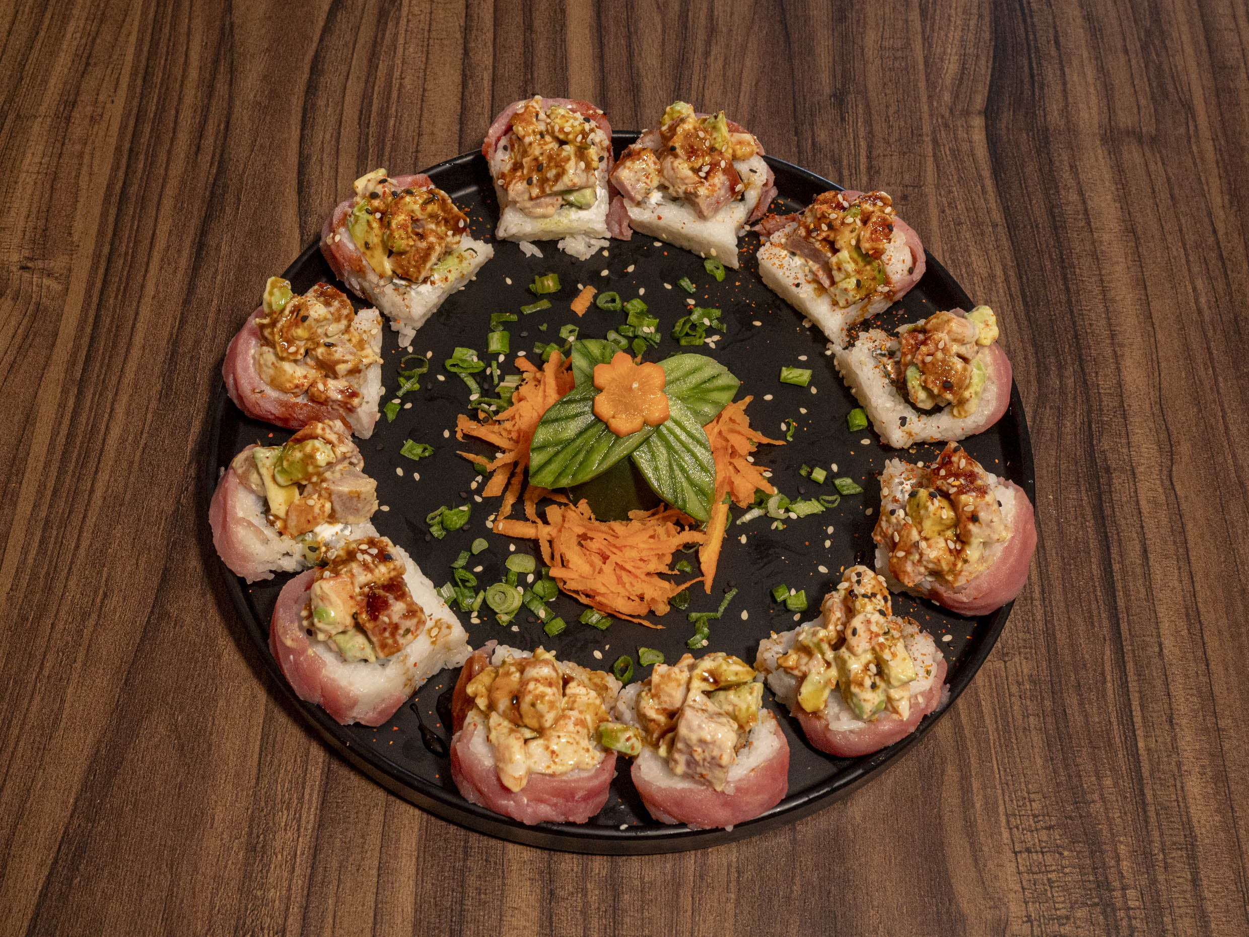 Philadelphia, pepino, aguacate, camarón empanizado por dentro. Por fuera forrado de atún con topping de camarón, atún y toque salsa de anguila.