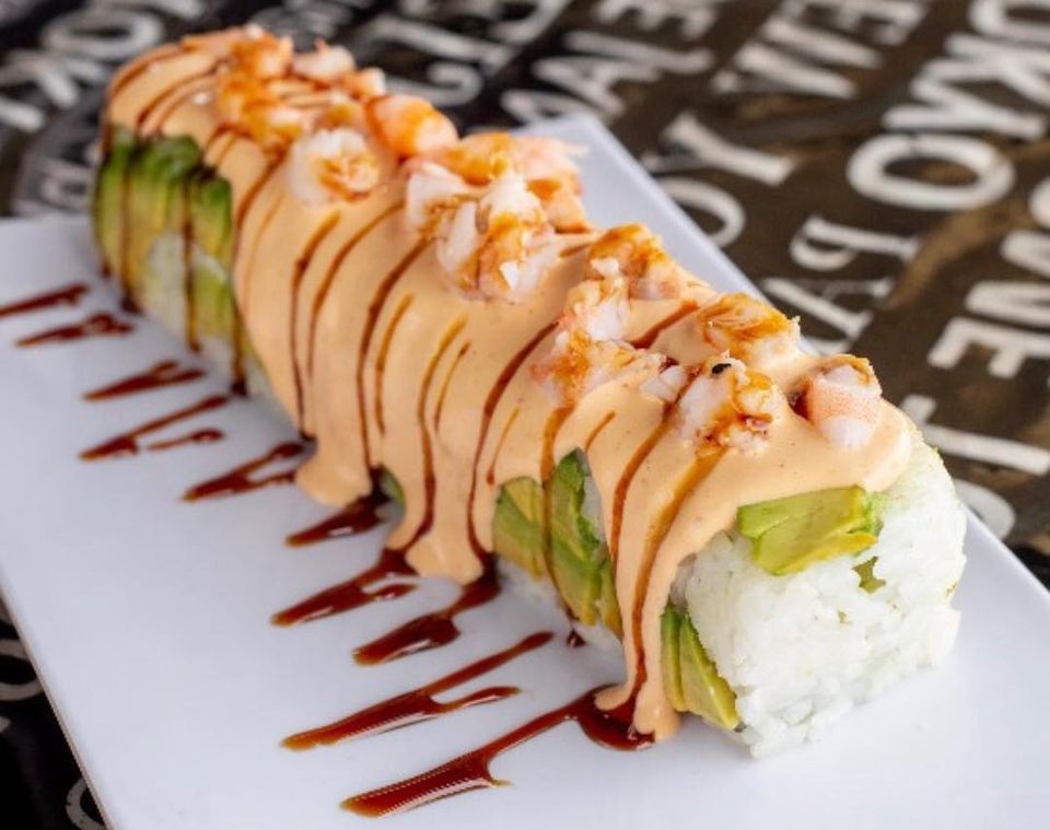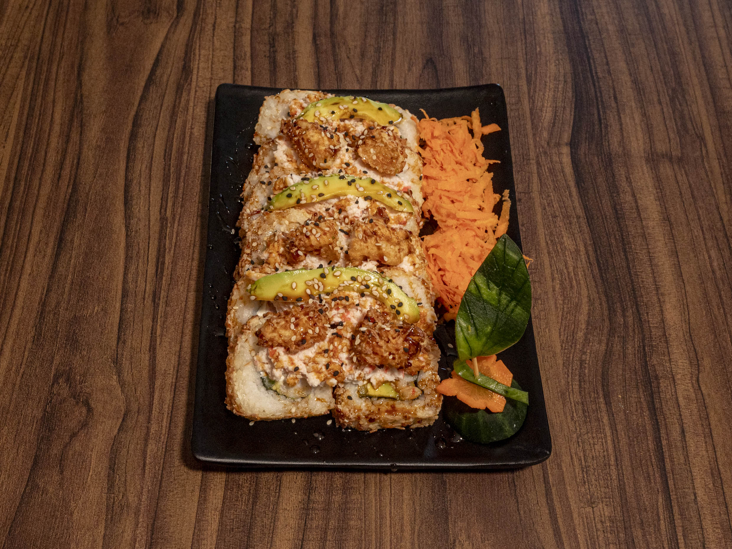 Philadelphia, pepino, aguacate, cangrejo y camarón empanizado por dentro. Por fuera envuelto en aguacate y encima topping de spicy de camarón bañado en salsa de anguila y ajonjolí.
